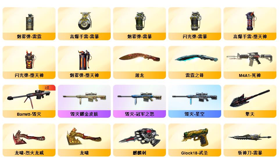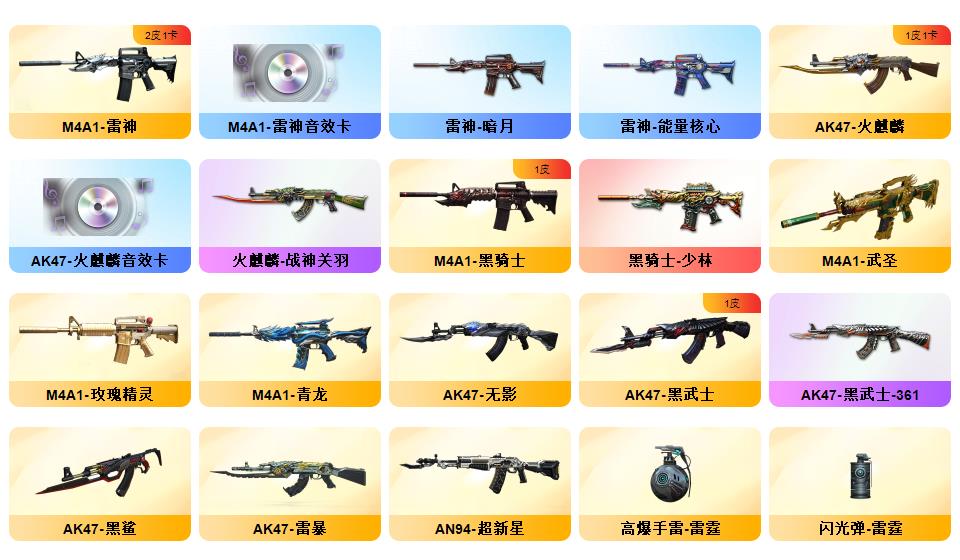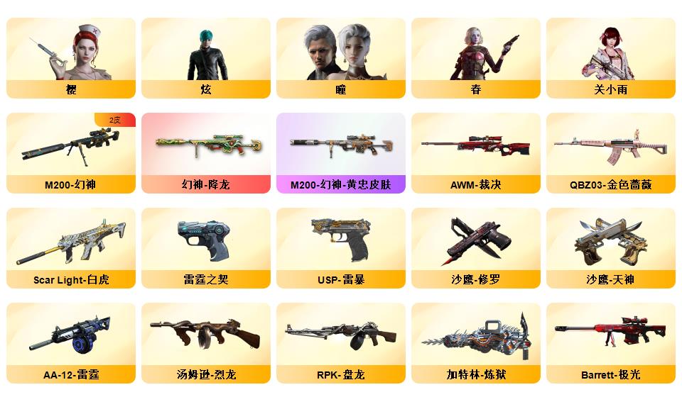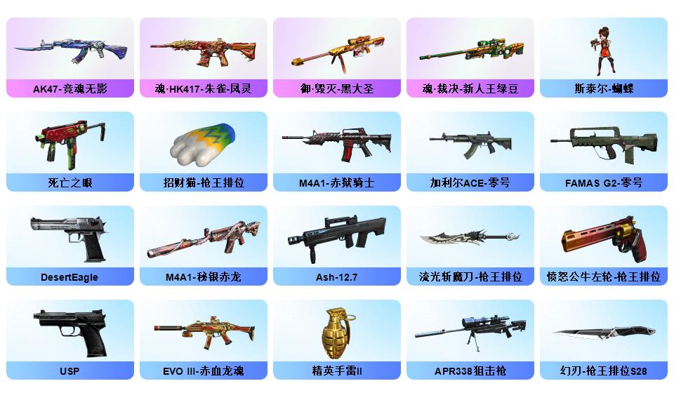 【幻神+幻神降龙+幻神黄忠】usp雷暴+cop雷霆【白虎 青龙】【黑骑士少林 火麒麟关羽 毁灭冠军之怒】【火麒麟 雷神音效卡】【王者霜心 王者之影 王者之魄 王者之怒】【qbz金色蔷薇 火麒麟 雷神 毁灭】3盘6烈4炼狱【雷暴套】【雷神呛娘蕾安娜 芭蕾特零水下丽影 斯泰尔蝴蝶 cop旗袍】【关小雨 王者沙漠玫瑰 雨棠】ac+工具包+手雷包