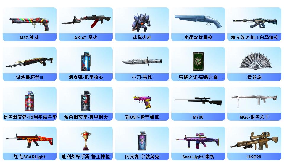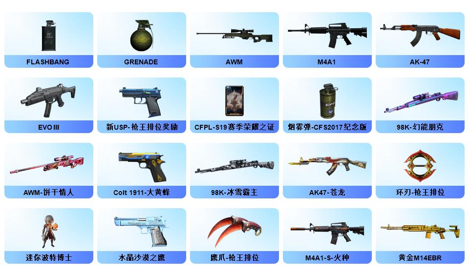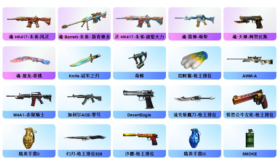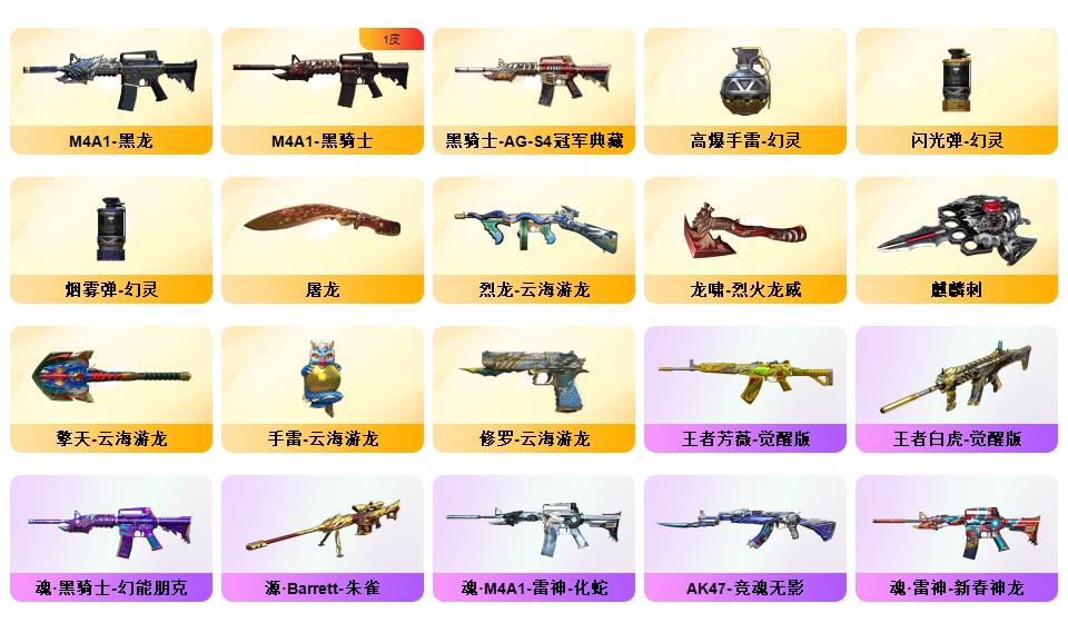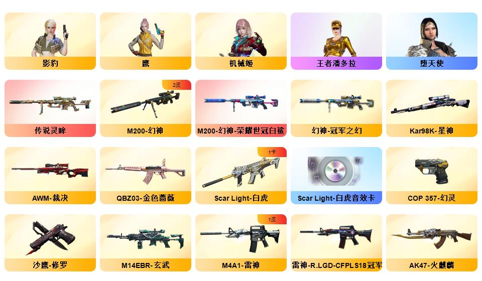 【传说灵眸】【幻神+幻神冠军之幻+幻神荣耀世冠白鲨】【cop幻灵】【2冠军之刃】【星神】【白虎+白虎电玩粉兔+白虎音效卡】【影豹+鹰+机械姬+王者潘多拉+云海玲珑满套装+职业经理】【觉醒王者白虎】【玄武】【觉醒王者芳薇】【qbz金色蔷薇+qbz巅峰荣耀】【雷神lgd冠军+黑龙冠军之武+黑骑士ag冠军典藏】【5黑骑士】【雷神/火麒麟/黑龙/裁决】【烈龙云海游龙+毒蜂】1911大黄蜂【xrock炫彩背包】【工具钳手雷