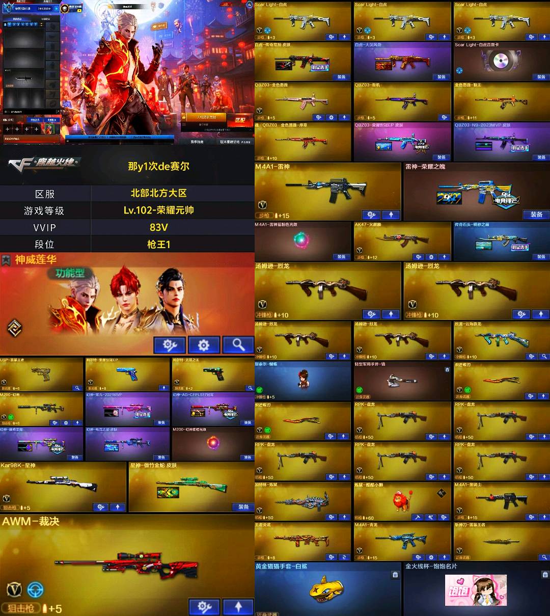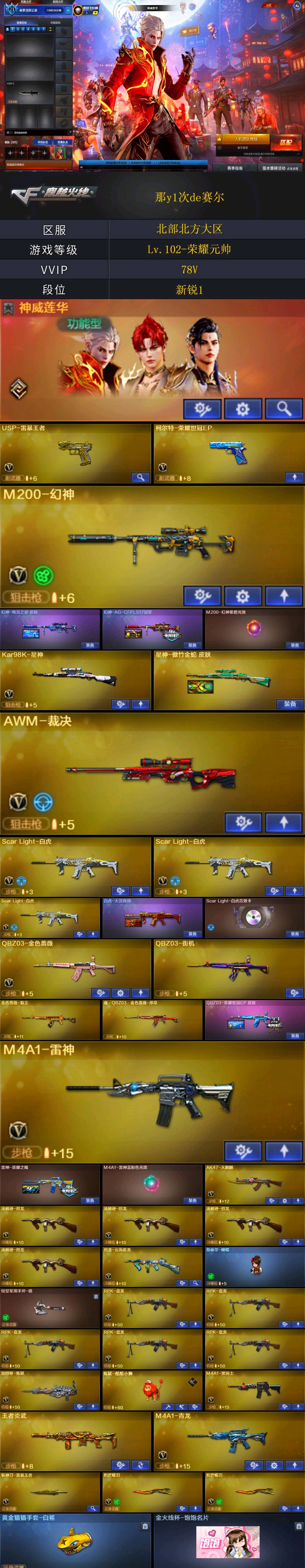 【🈲止使用鼠标宏,DMA,外挂进行游戏,造成损失后果自负!!!】 【订单时间快到了🈲止再开排位赛,导致账号禁赛的租客将被永久拉黑!】 本账号经过网络财产备案,一经发现直接报警处理立案追责,根据账号价值全额赔偿感谢支持谢谢合作谢谢合作!!!!禁止利用账号进行开挂、使用辅助违规软件诈骗等违规操作!;柯尔特-无冕之王,USP-雷暴王者,炽芒蝶刃,隼,RPK-盘龙,QBZ03-金色蔷薇,M200-幻神,