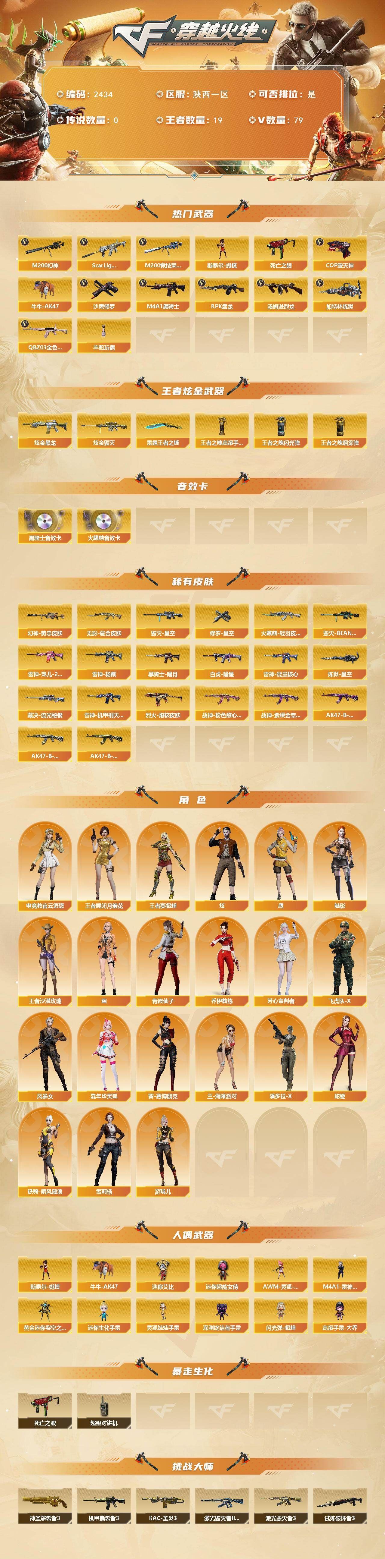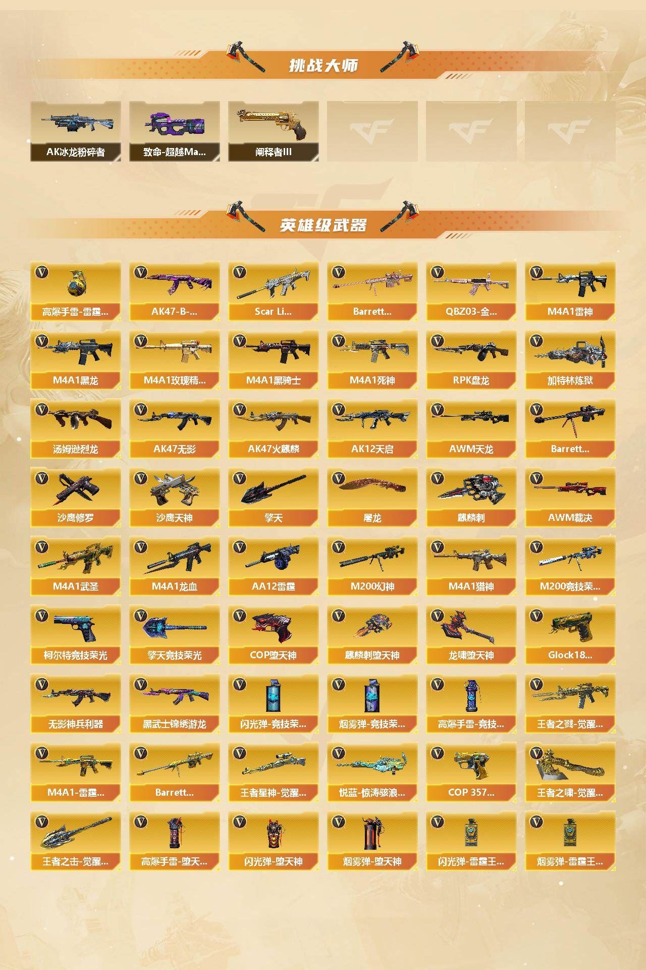 【热门武器】:QBZ03-金色蔷薇,Scar Light-白虎,M200-幻神,M200-竞技荣光,死亡之眼,牛牛-AK47,M4A1-黑骑士,汤姆逊-烈龙*2,RPK-盘龙*2,加特林-炼狱*4,斯泰尔-蝴蝶,羊驼玩偶,COP-堕天神,沙鹰-修罗【王者炫金武器】:雷霆王者之锋,炫金黑龙,炫金毁灭,王者之魄高爆手雷,王者之魄闪光弹*2,王者之魄烟雾弹【音效卡】:AK47-火麒麟音效卡,M4A1-黑骑士音效卡【皮肤】:M200-幻神-黄忠皮肤,Scar Light-白虎-暗星,裁决-流光秘银,雷神-能量核心,雷神-宠儿-2019MVP,雷神-杨戬,雷神-机甲刑天皮肤,火麒麟-轻羽皮肤,毁灭-星空,毁灭-BEAN-2020MVP,黑骑士-暗月,无影耀金皮肤,烈火-熔核皮肤,战神-粉色甜心皮肤,战神-紫绶金章皮肤,AK47-B-常胜将军-曹操,AK47-B-常胜将军-刘备,AK47-B-常胜将军-孙权*3,炼狱-星空,修罗-星空【角色】:魅影,炫,电竞教官-云悠悠,鹰,王者-瞳-闭月羞花,王者-葵-貂蝉,王者沙漠玫瑰,乔伊教练,芳心审判者,飞虎队-X,风暴女,嘉年华灵狐,葵-赛博朋克,兰-海滩派对,潘多拉-X,青霞仙子,蛇姬,铁骑-乘风破浪,雪莉杨,幽,游珑儿【人偶武器】:M4A1-雷神-精英刀锋,斯泰尔-蝴蝶,AWM-灵狐-15周年嘉年华*2,牛牛-AK47,黄金迷你裂空之翼,迷你生化手雷*2,深渊终结者手雷,闪光弹-貂蝉,高爆手雷-大乔,迷你艾比,迷你超能女侍,灵狐娃娃手雷【暴走生化】:死亡之眼,超级对讲机【挑战大师】:致命乱世-超越Max,神圣爆裂者III,AK47-冰龙粉碎者,激光毁灭者III-白马银枪,激光毁灭者III,机甲撕裂者III,试炼破坏者III*2,KAC-圣炎切割者III,阐释者III【英雄级武器】:AK47-火麒麟*2,M4A1-黑龙,M4A1-雷神,M4A1-黑骑士,AK47-无影,M4A1-死神,AK12-天启,M4A1-武圣,M4A1-龙血,Scar Light-白虎,无影-神兵利器,黑武士-锦绣游龙,M4A1-玫瑰精灵,QBZ03-金色蔷薇,M4A1-猎神,王者之戮-觉醒版,AK47-B-常胜将军,M4A1-雷霆王者-觉醒版,AWM-天龙,Barrett-毁灭*2,AWM-裁决*2,M200-幻神,M200-竞技荣光,Barrett-金色蔷薇,Barrett-雷霆王者-觉醒版,王者星神-觉醒版,RPK-盘龙*2,加特林-炼狱*4,悦蓝-惊涛骇浪-觉醒版,汤姆逊-烈龙*2,AA-12-雷霆,沙鹰-修罗,沙鹰-天神,COP-堕天神,COP 357-雷霆王者-觉醒版*2,柯尔特-竞技荣光,Glock18-武圣,屠龙,麒麟刺-堕天神,擎天*2,麒麟刺*2,擎天-竞技荣光,龙啸-堕天神*2,王者之啸-觉醒版*2,王者之击-觉醒版,高爆手雷-堕天神*2,高爆手雷-竞技荣光,高爆手雷-雷霆王者-觉醒版,闪光弹-堕天神*2,闪光弹-竞技荣光,闪光弹-雷霆王者-觉醒版*2,烟雾弹-堕天神*2,烟雾弹-竞技荣光*2,烟雾弹-雷霆王者-觉醒版【道具】:CFS限定背包,超级背包,绿色巨人,灵魂忍者,变异宝贝,生化弹匣,夺命之镰,防化服*2,金色流光-枪王排位*2,星辰流光-枪王排位,枪王排位28赛季金色流光,枪王排位29赛季金色流光,语音特效-生化,电玩兔兔表情,新黄金C4,C4-红龙,C4-沙漠,防弹头盔*3,防弹衣*3,C4工具钳*2,手雷包*2【特殊枪械】:蝴蝶斯泰尔+2烈龙,1白虎,1黑骑士,2烈龙,2盘龙,4炼狱,1蝴蝶斯泰尔】;电竞教官-云悠悠,王者沙漠玫瑰,RPK-盘龙,QBZ03-金色蔷薇,M200-幻神,Scar Light-白虎,