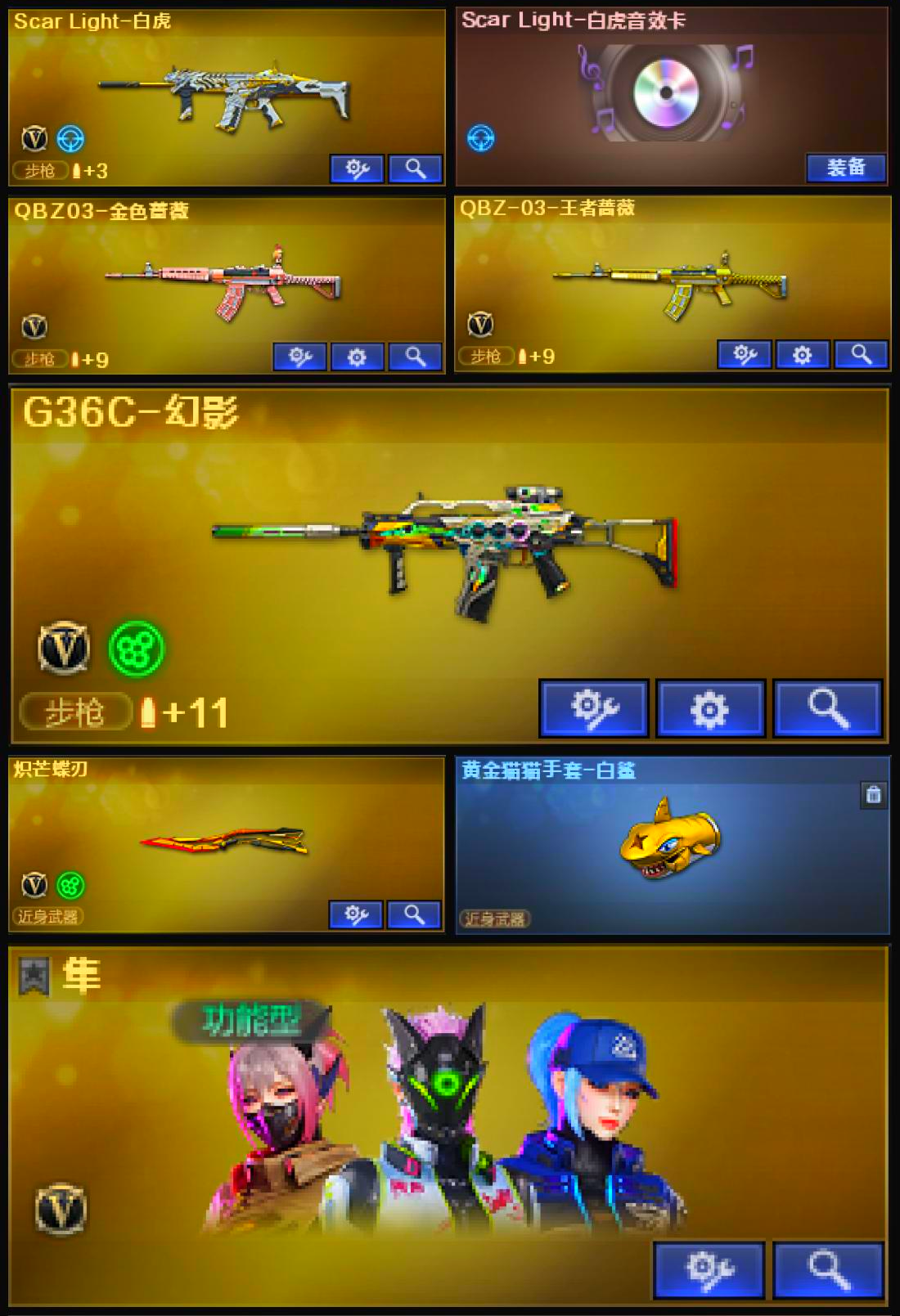 幽瞳辉光♥幻神三件套星神三件套裁决流光qbz白虎G36幻影♥VSK王幻六烈蝴蝶黄金鲨鱼手套♥蝴蝶刀;炽芒蝶刃,隼,电竞教官-云悠悠,QBZ03-金色蔷薇,传说幽瞳,G36C-幻影,M200-幻神,