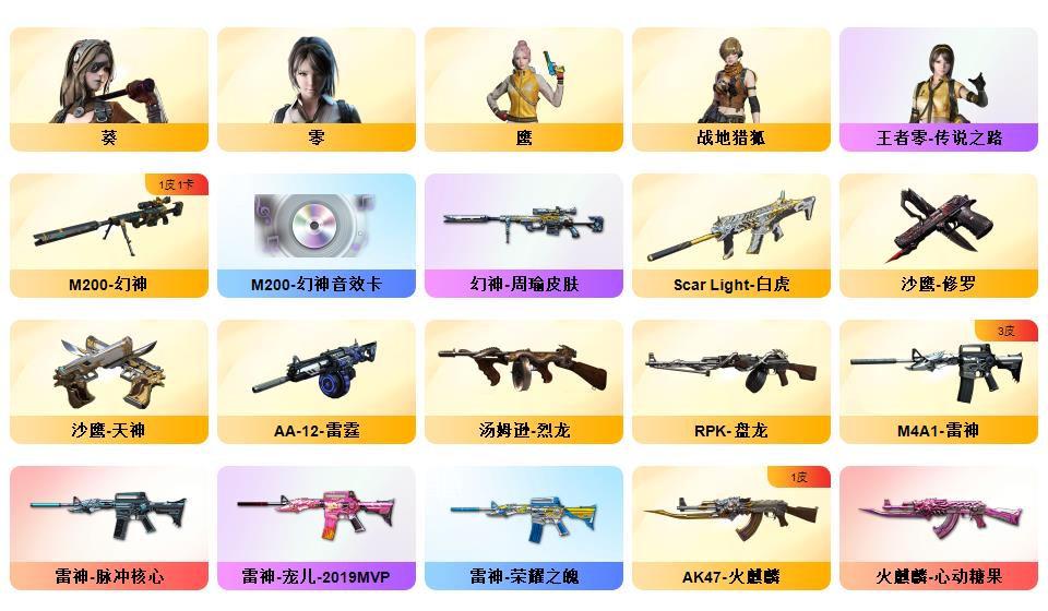 【幻神+幻神周瑜+幻神音效卡】【王者星神】【白虎】【鹰+职业选手】【朱雀】【觉醒王者之魄/势】【雷神宠儿+雷神脉冲核心+毁灭风暴+雷神荣耀之魄+毁灭荣耀之怒+屠龙荣耀之锋】【毁灭音效卡+黑骑士音效卡】雷神/火麒麟/黑骑士/黑武士/天龙/毁灭【6烈龙+斯泰尔蝴蝶+死亡之眼】【雷神精英刀锋】1911大黄蜂【猫猫手套】【超级背包+sv炫彩背包】【工具钳手雷包】