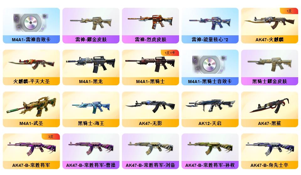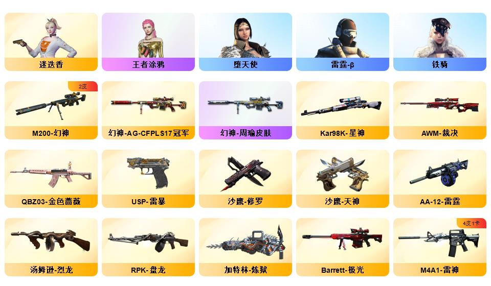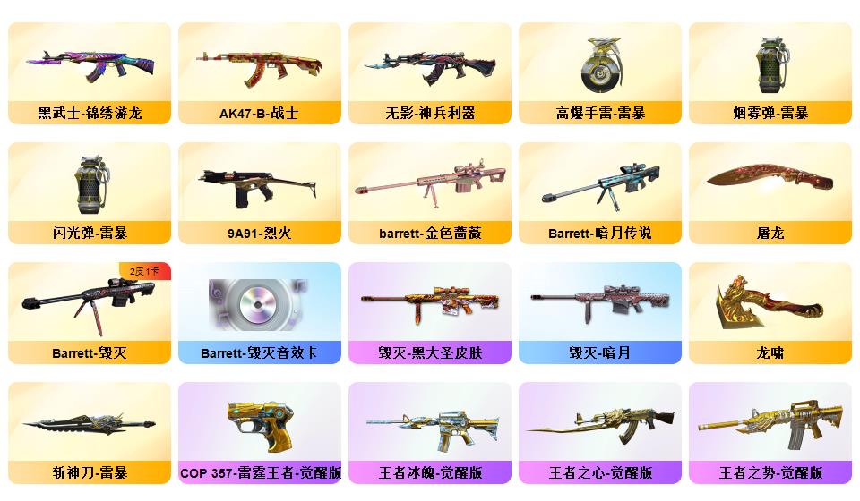 【幻神+幻神ag冠军+幻神周瑜】【usp雷暴+cop雷霆王者】【星神】【迷迭香+王者涂鸦】【qbz金色蔷薇】【觉醒王者冰魄】【雷神烈虎皮肤】【雷神音效卡+毁灭音效卡+黑骑士音效卡】【觉醒王者之心/势】【2炼狱+6烈龙+异变清道夫+斯泰尔蝴蝶】【天龙曼陀罗】【金刚伞】【cop旗袍】【超级背包+炫彩背包】【工具钳手雷包】