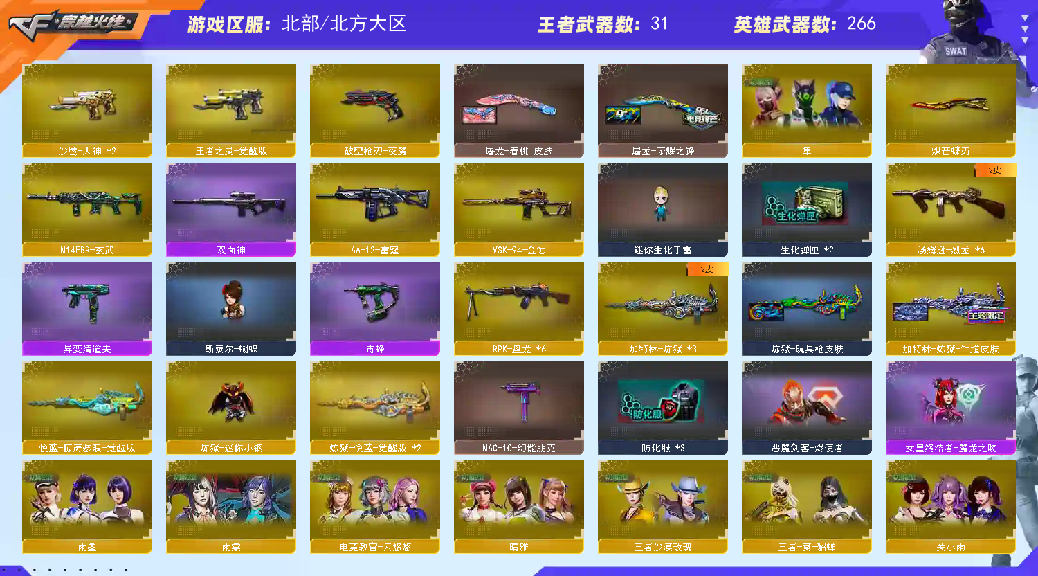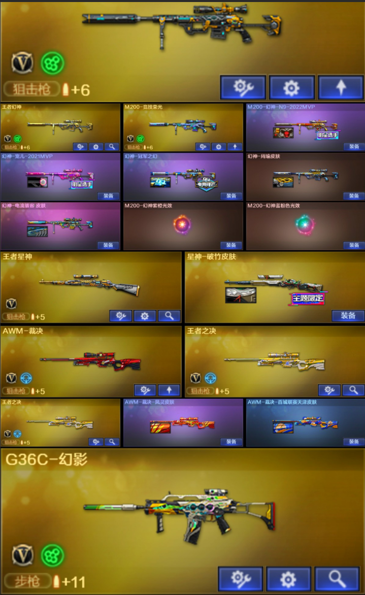 六传说/满配22把副手/传说艾莉莎/幻神5皮宠儿/王者星神/裁决双皮G36幻影6盘6烈6黑骑士白虎冠薇;USP-雷暴,荣耀世冠-柯尔特,柯尔特-冠军之特,炽芒蝶刃,隼,电竞教官-云悠悠,晴雅,
