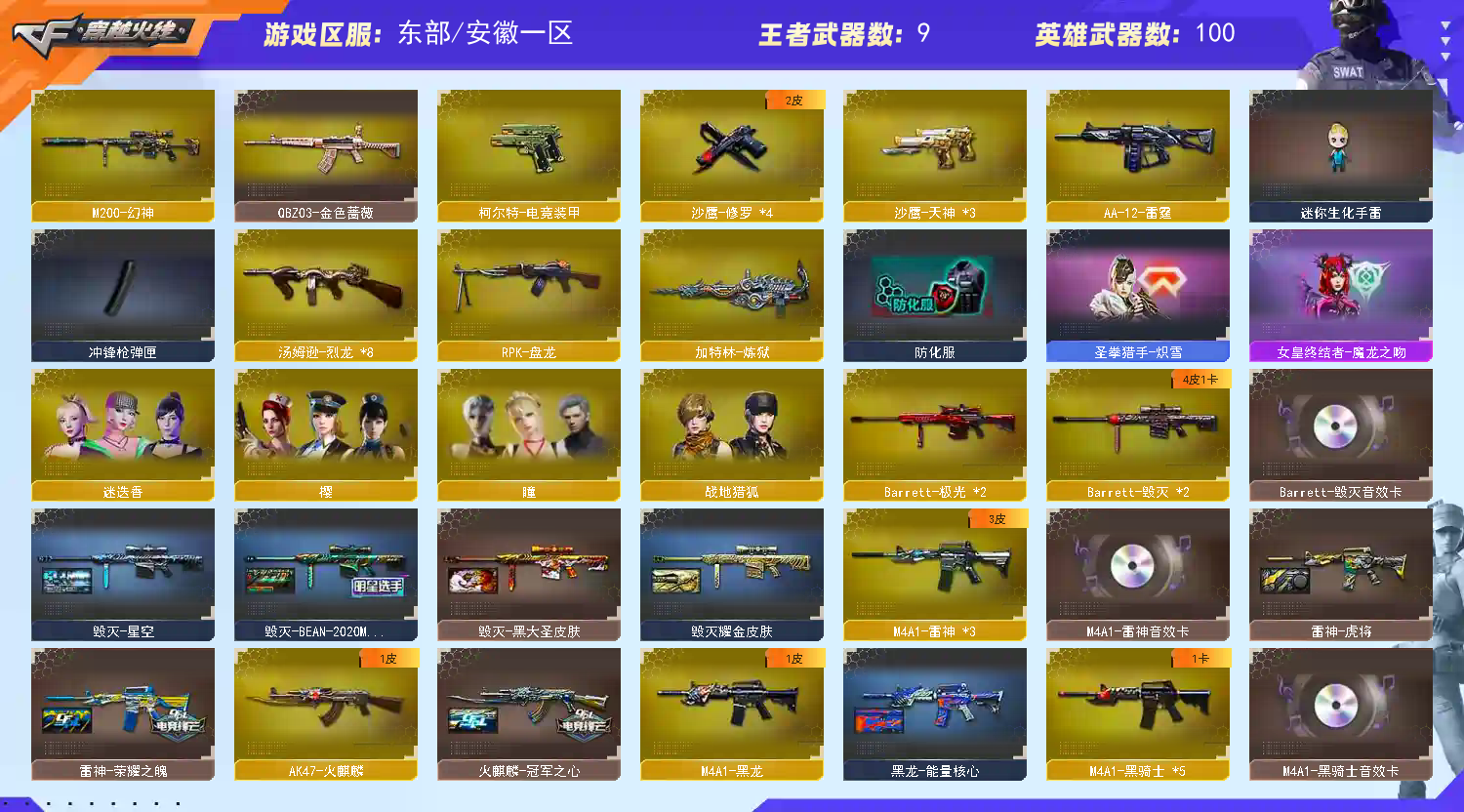 【m200幻神】【6烈龙 盘龙 炼狱 死亡之眼 6黑骑士 】【白虎电玩】【qbz金色蔷薇】【朱雀】【火麒麟+冠军之心】【黑龙】【雷神+卡+荣耀之魄】【黑骑士+卡 】【毁灭+卡+bean】【极光】【武器: 王者之武 王者之魄 王者之势 王者之戮 】【7手枪:修罗*4 天神*3 电竞装甲】【12刀具:屠龙*6 龙啸*2 擎天*2 麒麟刺 斩神刀雷暴 堕天神*2 王者之啸】【6雷套:电竞装甲 雷暴雷 堕天神雷*4 】【音效卡:毁灭音效卡 黑骑士音效卡 雷神音效卡 】【角色:迷迭香 瞳 樱 不败狙神 零纪元】;RPK-盘龙,QBZ03-金色蔷薇,M200-幻神,
