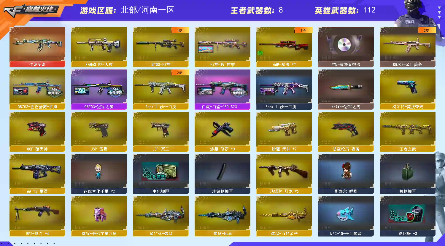 ★收藏好评! 由于异地登录保护机制,部分客户在使用客户端自动上号时会出现密码错误,注意本号密码不会错误,请多尝试5-6次!本账号已经过虚拟财产认定,请各位科技大神高抬贵手。请素质租号,文明游戏,谢谢大家配合!!;USP-雷暴,Knife-冠军之刃,电竞教官-云悠悠,RPK-盘龙,QBZ03-金色蔷薇,M200-幻神,Scar Light-白虎,