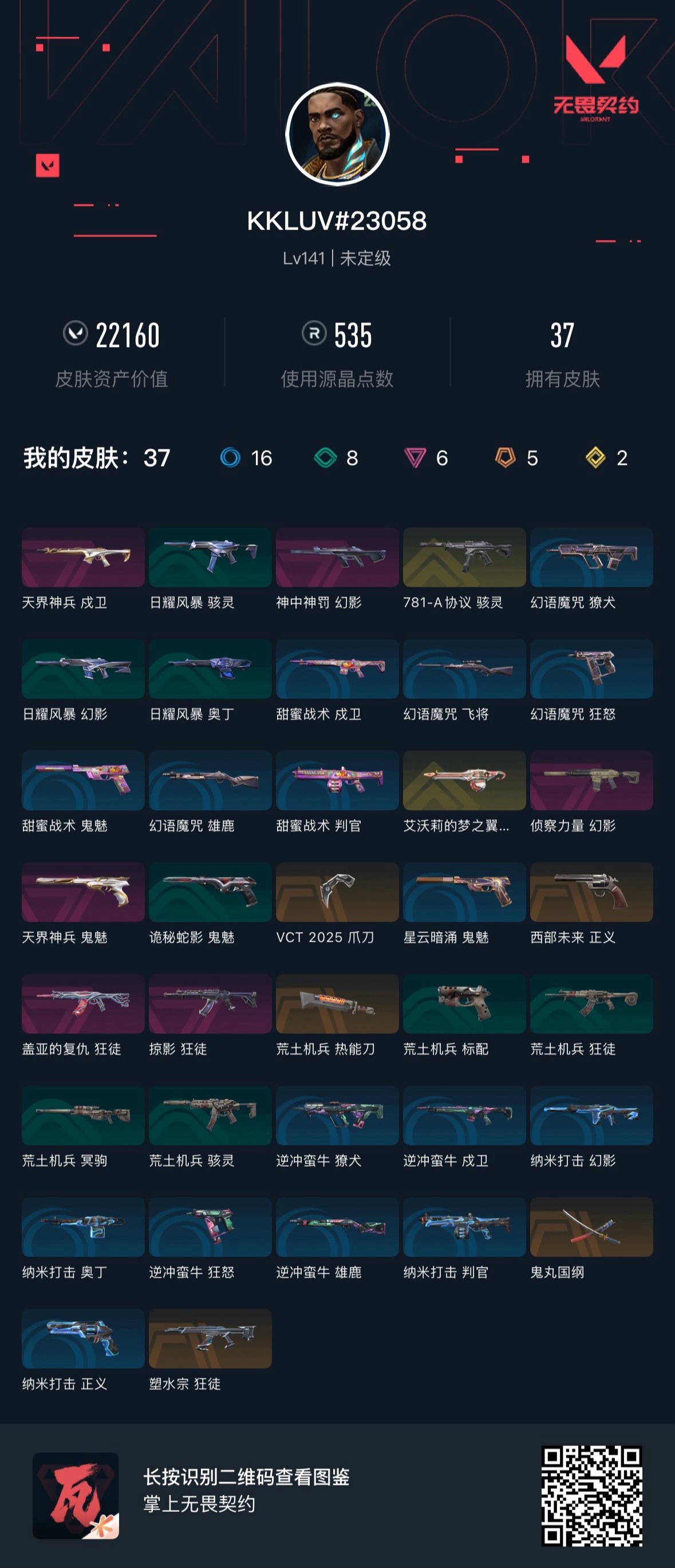 无畏契约/Lv141/37皮/鬼丸国纲/塑水宗狂徒/掠影狂徒/盖亚的复仇狂徒/VCT2025爪刀