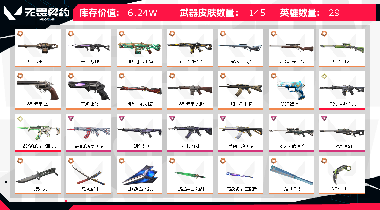 般若套西部套,剥皮小刀,显卡爪,蝴蝶刀等热门武器;西部未来 奥丁,奇点 战神,剥皮小刀,偃月苍龙 判官,盖亚的复仇 狂徒,掠影 戍卫,掠影 狂徒,