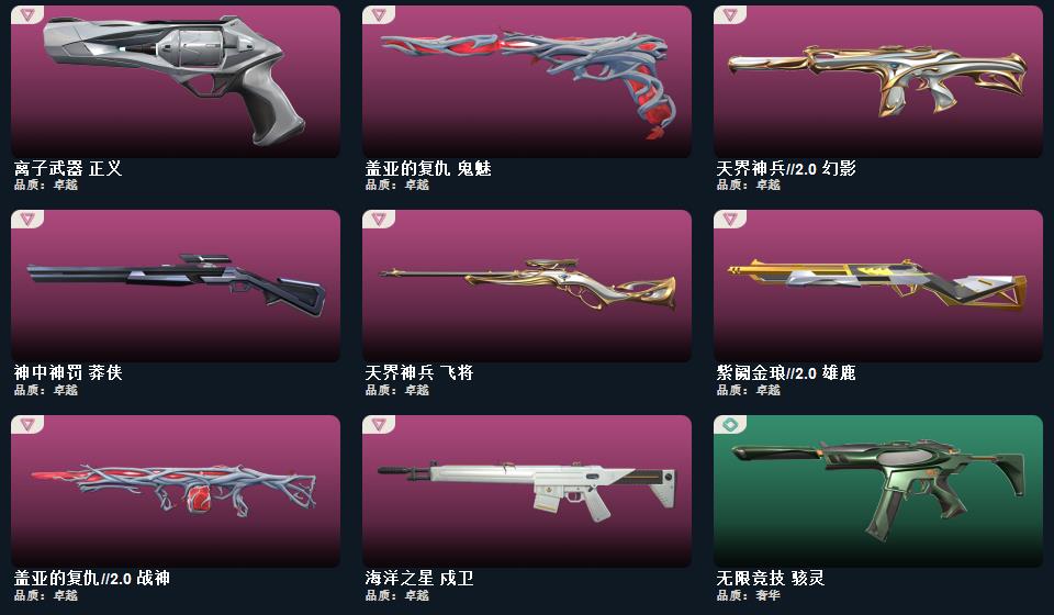 【无畏契约】《鬼丸国纲+星际猎兵短剑+神罚军刀+2025全球冠军赛蝴蝶刀+阿特拉斯指挥部甩棍+黑波之刃+魔术火花+rgx11zPro3.0爪刀》《2025全球冠军赛狂徒+洪荒怒焰狂徒+混沌序曲狂徒+艾沃莉的梦之翼狂徒+盖亚的复仇狂徒》《侦察力量幻影么+天界神兵2.0幻影》《塑水宗骇灵》《奇点正义》《vct25xblg标配》《艾沃莉的梦之翼奥丁》《盖亚的复仇鬼魅》《离子武器正义》《紫阙金琅2.0雄鹿》《神中神罚2.0雄鹿》《神中神罚莽侠》《海洋之星戍卫》《天界神兵飞将》《盖亚的复仇2.0战神》
