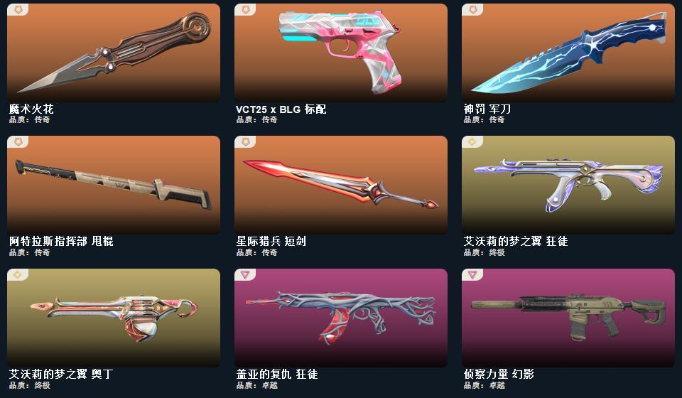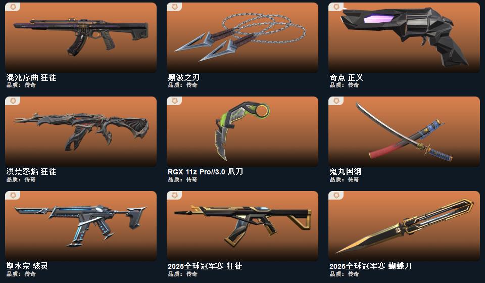 【无畏契约】《鬼丸国纲+星际猎兵短剑+神罚军刀+2025全球冠军赛蝴蝶刀+阿特拉斯指挥部甩棍+黑波之刃+魔术火花+rgx11zPro3.0爪刀》《2025全球冠军赛狂徒+洪荒怒焰狂徒+混沌序曲狂徒+艾沃莉的梦之翼狂徒+盖亚的复仇狂徒》《侦察力量幻影么+天界神兵2.0幻影》《塑水宗骇灵》《奇点正义》《vct25xblg标配》《艾沃莉的梦之翼奥丁》《盖亚的复仇鬼魅》《离子武器正义》《紫阙金琅2.0雄鹿》《神中神罚2.0雄鹿》