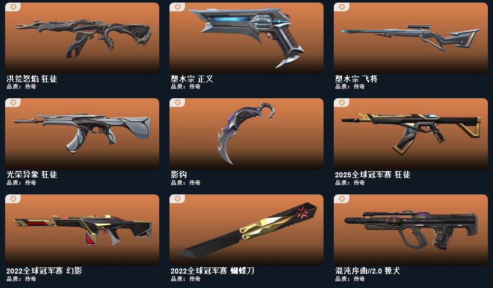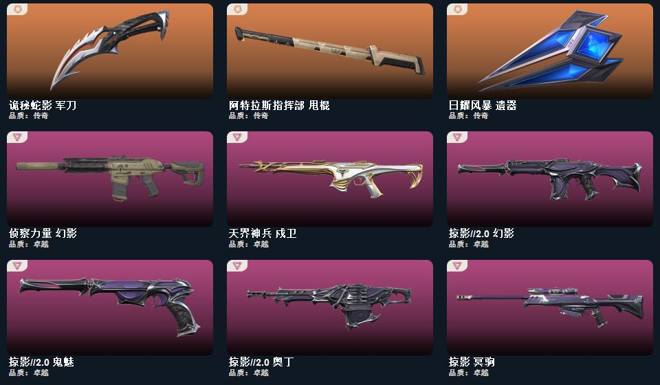 【无畏契约】《阿特拉斯指挥部甩棍+影钩+2022全球冠军赛蝴蝶刀+日耀风暴遗器+诡秘蛇影军刀》《2025全球冠军赛狂徒+洪荒怒焰狂徒+光荣异象狂徒》《2022全球冠军赛幻影+侦察力量幻影+掠影2.0幻影》《掠影冥驹》《混沌序曲2.0獠犬》《塑水宗飞将》《塑水宗正义》《天界神兵戍卫》《掠影2.0奥丁》《掠影2.0鬼魅》《掠影2.0骇灵》