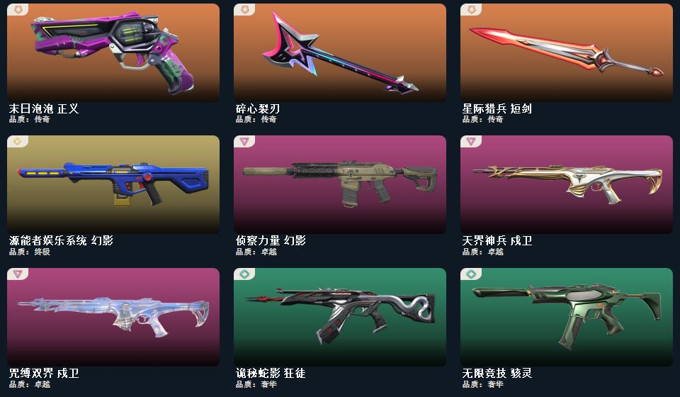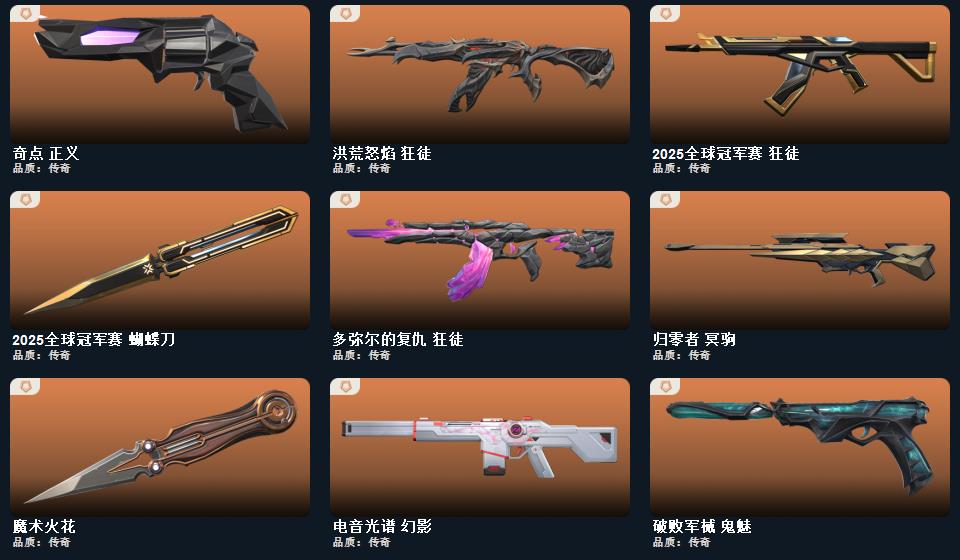 【无畏契约】《2025全球冠军赛蝴蝶刀 魔术火花 碎心裂忍 星际猎兵短剑》《2025全球冠军赛狂徒 洪荒怒焰狂徒 多弥尔的复仇狂徒》《源能者娱乐系统幻影 电音光谱幻影 侦察力量幻影》《归零者冥驹》《破败军械鬼魅》《奇点正义 末日泡泡》《天界神兵戍卫》