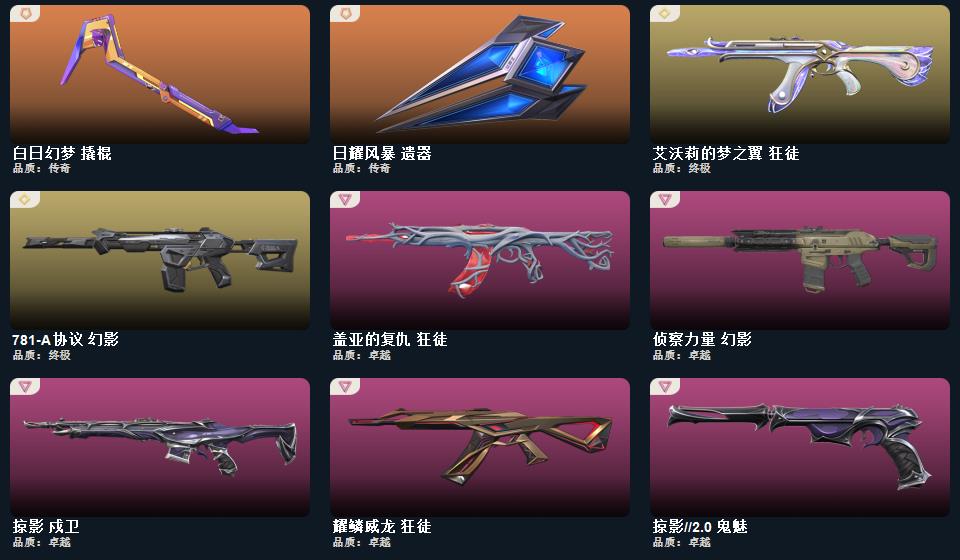 wegame无畏契约★武器皮肤数量:53,剥皮小刀,RGX 11z Pro//3.0 爪刀,2022全球冠军赛 蝴蝶刀,日耀风暴 遗器,紫金爪刀,起源 环刃,诡秘蛇影 军刀,白日幻梦 撬棍,阿特拉斯指挥部 标配,日耀风暴 骇灵,掠影 戍卫,2025全球冠军赛 狂徒,甜蜜战术 冥驹,日耀风暴 奥丁