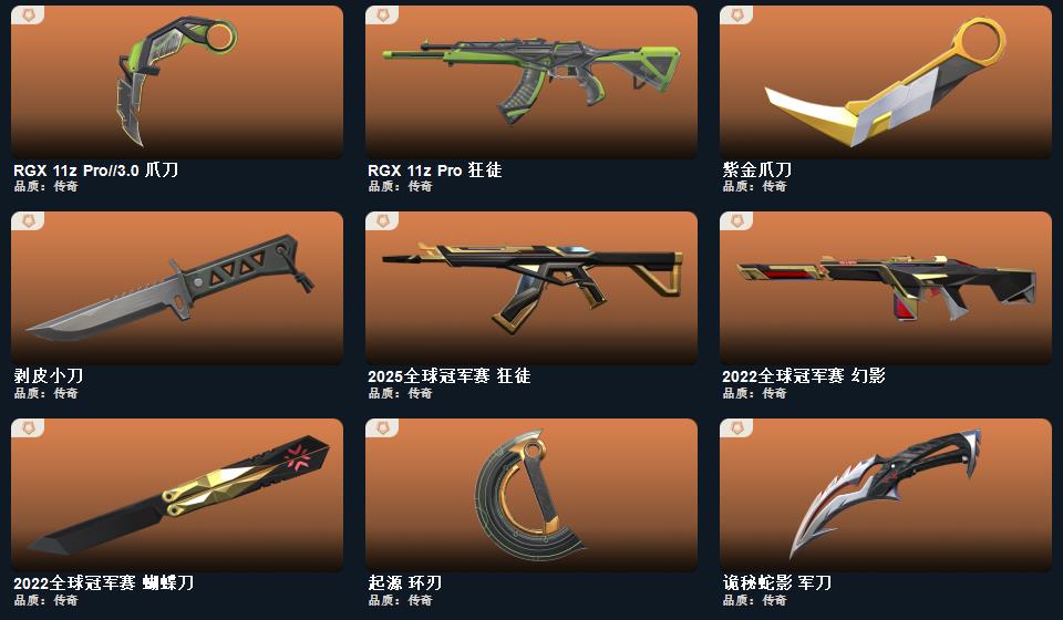 剥皮小刀,RGX 11z Pro//3.0 爪刀,2022全球冠军赛 蝴蝶刀,日耀风暴 遗器,紫金爪刀,起源 环刃,诡秘蛇影 军刀,白日幻梦 撬棍,阿特拉斯指挥部 标配,日耀风暴 骇灵,掠影 戍卫,2025全球冠军赛 狂徒,甜蜜战术 冥驹,日耀风暴 奥丁