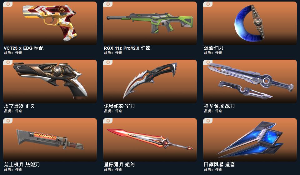 源始幻刃,星际猎兵 短剑,影钩,日耀风暴 遗器,诡秘蛇影 军刀,VCT 2025 爪刀,神圣领域 战刀,荒土机兵 热能刀,穿花蝴蝶,幻心猎手 鬼魅,瑰梦艺语 骇灵,紫阙金琅//2.0 雄鹿,偃月苍龙 狂徒,星际猎兵 飞将,光环序列 战神
