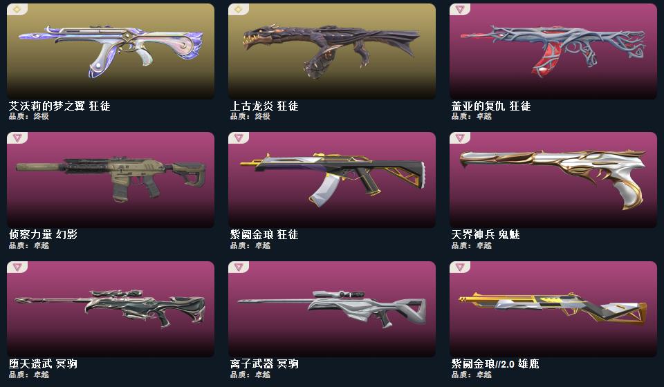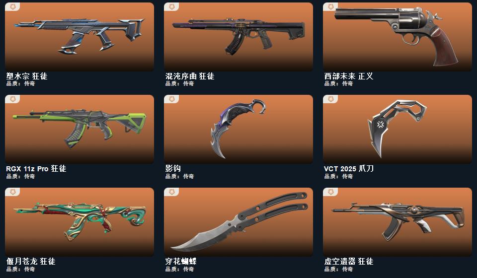 wegame无畏契约★武器皮肤数量:97,源始幻刃,星际猎兵 短剑,影钩,日耀风暴 遗器,诡秘蛇影 军刀,VCT 2025 爪刀,神圣领域 战刀,荒土机兵 热能刀,穿花蝴蝶,幻心猎手 鬼魅,瑰梦艺语 骇灵,紫阙金琅//2.0 雄鹿,偃月苍龙 狂徒,星际猎兵 飞将,光环序列 战神
