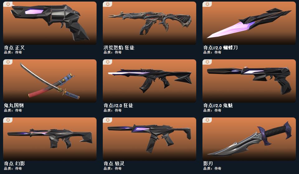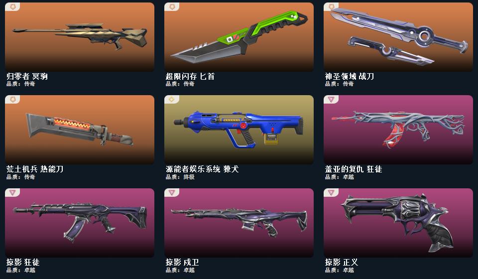 wegame无畏契约★武器皮肤数量:55,神圣领域 战刀,荒土机兵 热能刀,鬼丸国纲,超限闪存 匕首,影刃,奇点//2.0 蝴蝶刀,星云暗涌 鬼魅,神圣领域 獠犬,星云暗涌 冥驹,神圣领域 战神