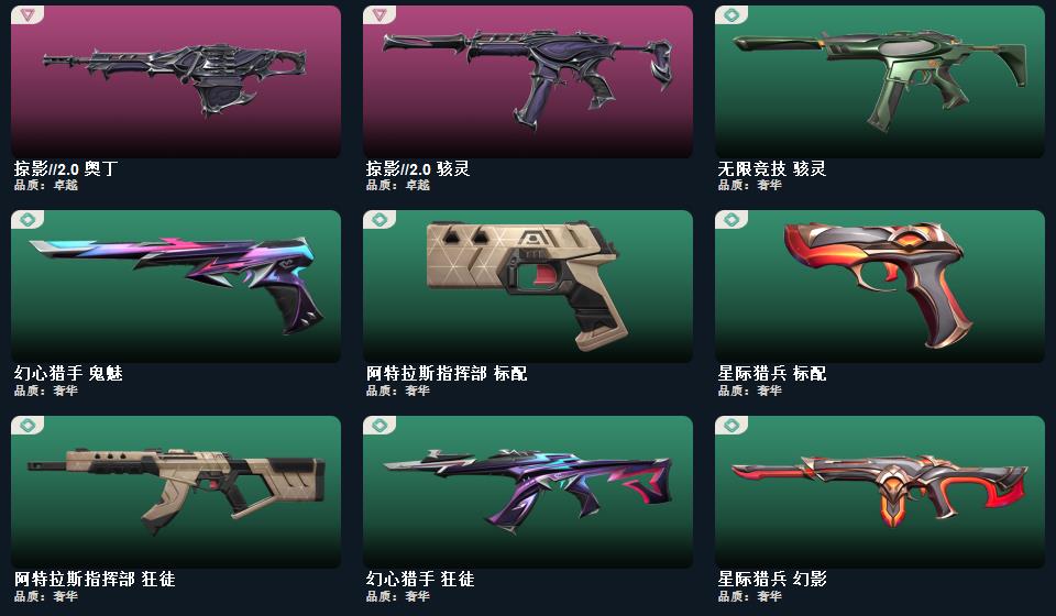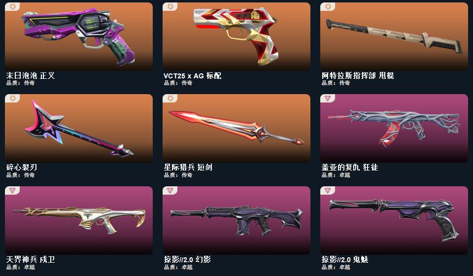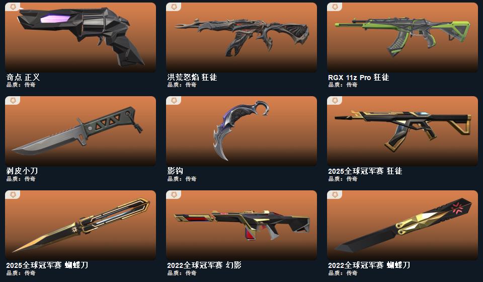 碎心裂刃,星际猎兵 短剑,2025全球冠军赛 蝴蝶刀,剥皮小刀,阿特拉斯指挥部 甩棍,影钩,2022全球冠军赛 蝴蝶刀,幻心猎手 鬼魅,甜心猎手 幻影,诛心猎手 冥驹,诛心猎手 奥丁