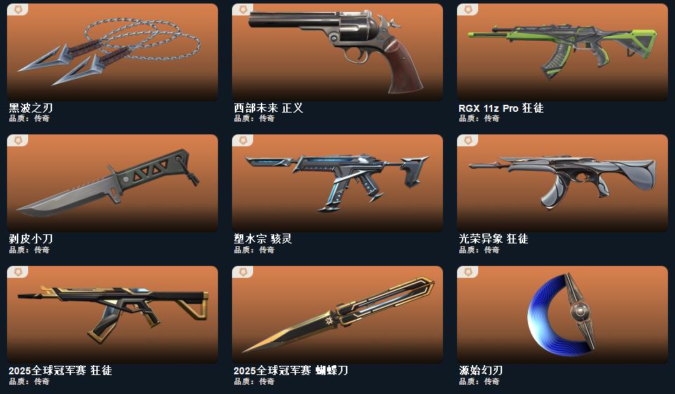 碎心裂刃,剥皮小刀,黑波之刃,2025全球冠军赛 蝴蝶刀,星际猎兵 短剑,源始幻刃,西部未来 正义,塑水宗 骇灵,冰点凝冻 狂徒,诛心猎手 冥驹