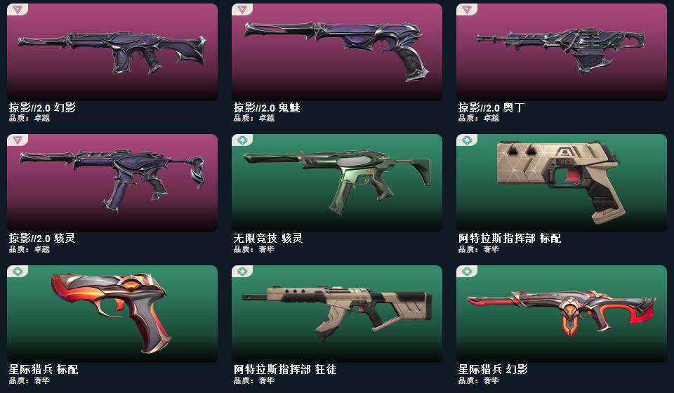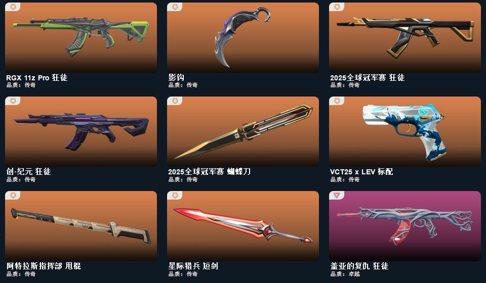 wegame无畏契约★武器皮肤数量:38,星际猎兵 短剑,2025全球冠军赛 蝴蝶刀,阿特拉斯指挥部 甩棍,影钩,星际猎兵 标配,无限竞技 骇灵,创·纪元 狂徒,光环序列 冥驹,光环序列 战神