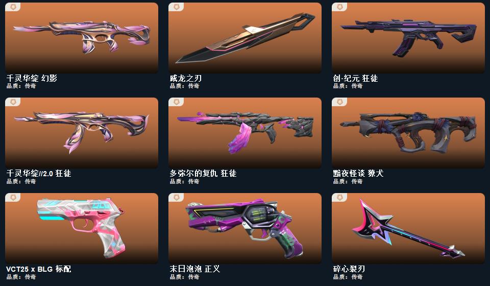wegame无畏契约★武器皮肤数量:27,碎心裂刃,威龙之刃,幻心猎手 鬼魅,甜心猎手 蜂刺,千灵华绽//2.0 狂徒,诛心猎手 冥驹,诛心猎手 奥丁