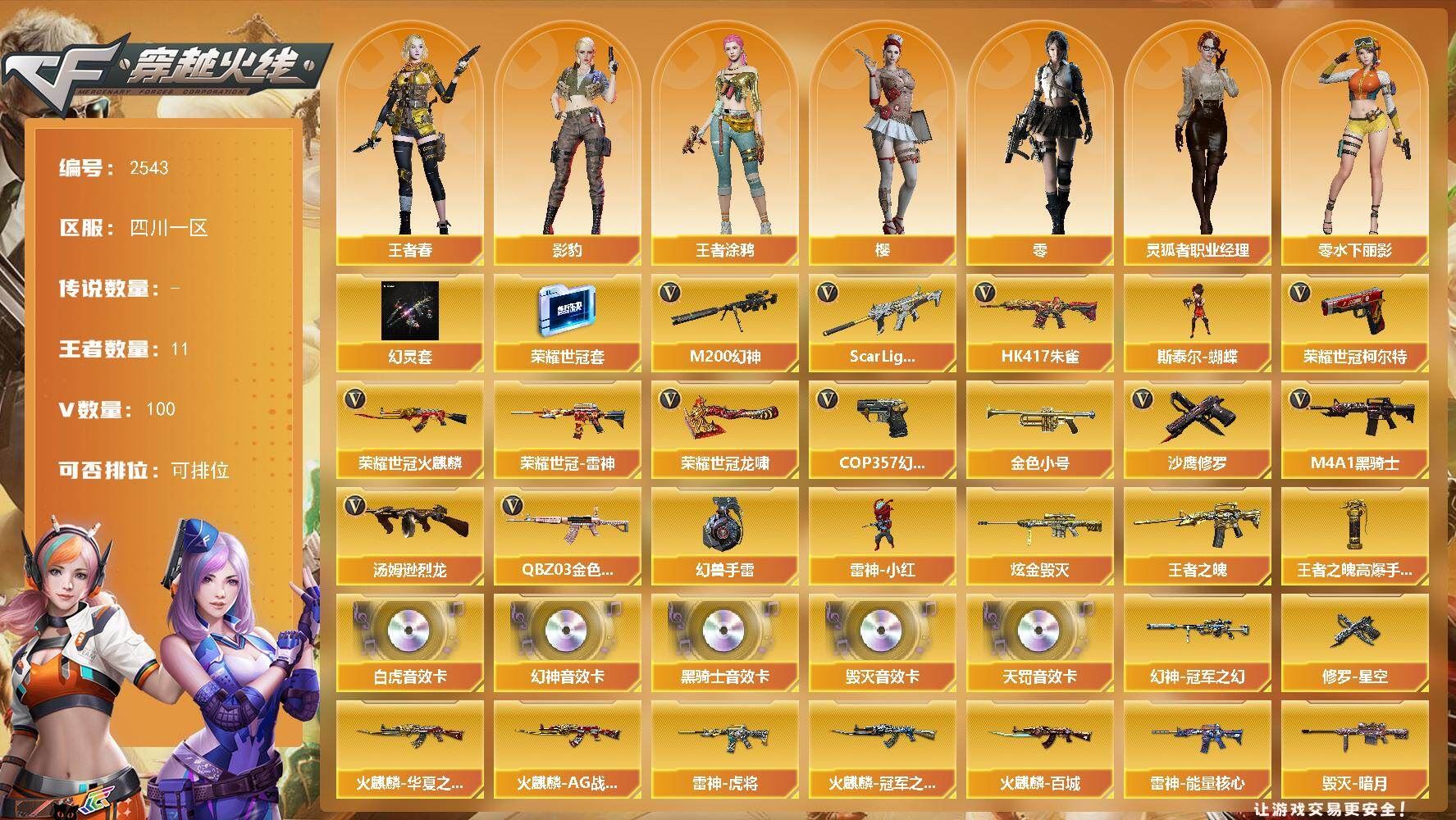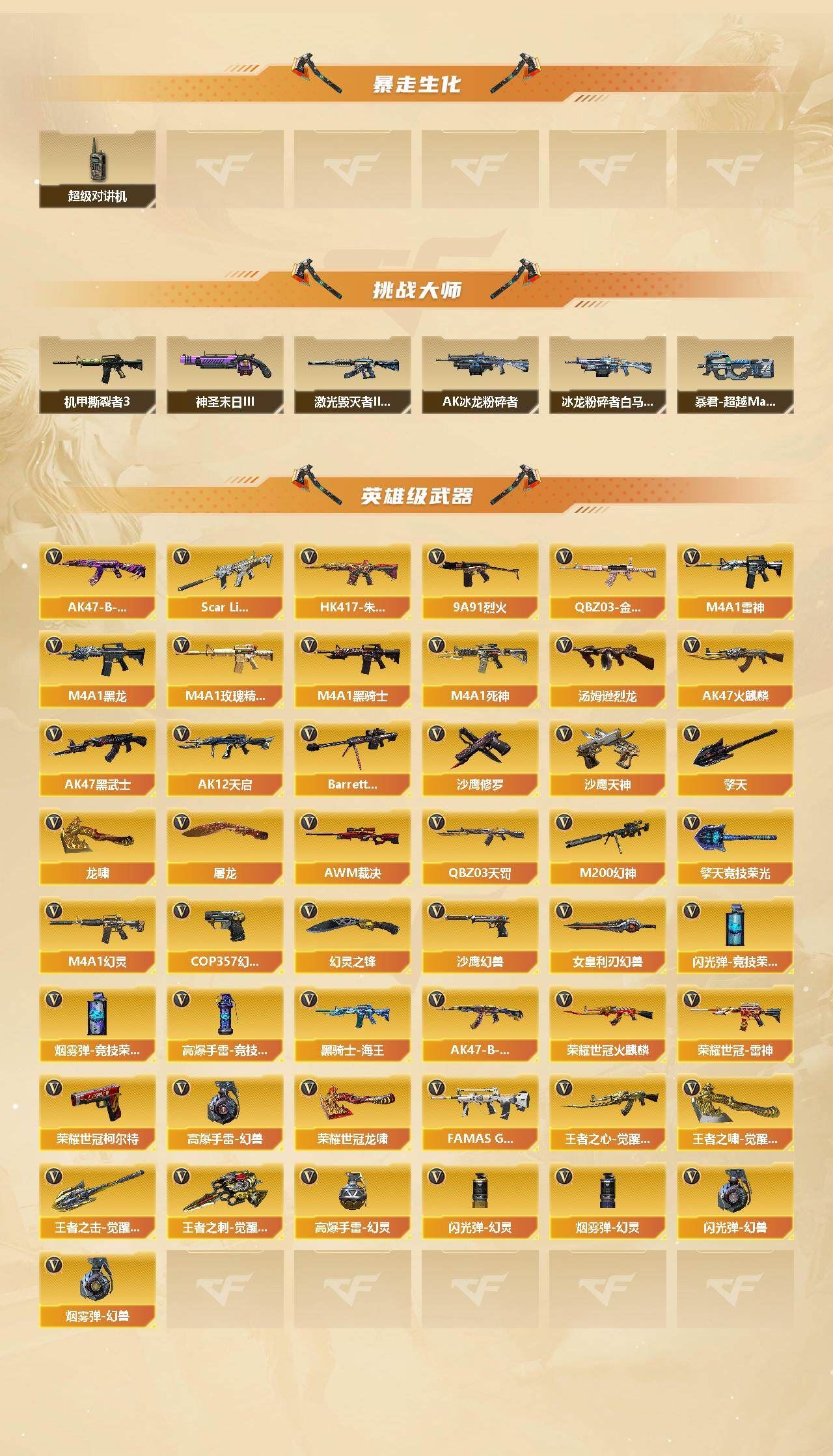 幻兽套-手雷套】【热门武器】:QBZ03-金色蔷薇,Scar Light-白虎,HK417-朱雀,M200-幻神,荣耀世冠-火麒麟,荣耀世冠-雷神,荣耀世冠-柯尔特*2,金色小号,M4A1-黑骑士*3,汤姆逊-烈龙*2,斯泰尔-蝴蝶,雷神-小红,COP 357-幻灵*2,沙鹰-修罗,荣耀世冠-龙啸,高爆手雷-幻兽【稀有套装】:幻灵套,荣耀世冠套【王者炫金武器】:王者之魄,炫金毁灭,王者之魄高爆手雷*2【音效卡】:M200-幻神音效卡,M4A1-黑骑士音效卡,Barrett-毁灭音效卡,Scar Light-白虎音效卡,QBZ03-天罚音效卡【皮肤】:幻神-冠军之幻,幻神-Heartshot 皮肤,金色蔷薇-Heartshot皮肤,雷神-能量核心,雷神-虎将,雷神-烈虎皮肤,雷神-机甲刑天皮肤,火麒麟-AG战队皮肤,火麒麟-雷神,火麒麟-冠军之心,火麒麟-华夏之心,火麒麟-平天大圣,火麒麟-百城,毁灭-暗月,毁灭-巅峰荣耀 皮肤,毁灭-英雄计划 皮肤,M4A1-千变-孔明皮肤*2,战神-粉色甜心皮肤,战神-紫绶金章皮肤,战神-流金岁月皮肤,AK47-B-常胜将军-曹操,AK47-B-常胜将军-刘备,AK47-B-常胜将军-孙权*2,修罗-星空【角色】:零,樱,四防影豹,四防王者春,王者涂鸦,四防王者雾萌萌,暗夜-X,风暴女,虎妞,娟娟,零-水下丽影,灵狐者-X,灵狐者-七夕宝贝,四防灵狐者-职业经理,龙儿-小淘气,潘多拉-X,潘多拉-甜心教官,蜀雪,铁骑荣耀,樱-战斗天使,影武者-X,海豹突击队【人偶武器】:雷神-小红,天龙-曼陀罗,斯泰尔-蝴蝶,COP-旗袍,迷你深渊冰龙,夺魂,迷你牛牛,迷你生化手雷,深渊终结者手雷,闪光弹-貂蝉,高爆手雷-大乔,迷你艾比,灵狐娃娃手雷【暴走生化】:超级对讲机【挑战大师】:暴君乱世-超越Max,AK47-冰龙粉碎者,冰龙粉碎者-白马银枪,激光毁灭者III-白马银枪,机甲撕裂者III,神圣爆裂者-末日III【英雄级武器】:AK47-火麒麟,M4A1-黑龙,M4A1-雷神*2,M4A1-黑骑士*3,M4A1-死神,AK47-黑武士,AK12-天启,HK417-朱雀,Scar Light-白虎,M4A1-幻灵,QBZ03-天罚,FAMAS G2-天戎,M4A1-玫瑰精灵,QBZ03-金色蔷薇,9A91-烈火,王者之心-觉醒版,AK47-B-战神,黑骑士-海王,AK47-B-常胜将军,荣耀世冠-火麒麟,荣耀世冠-雷神,Barrett-毁灭,AWM-裁决,M200-幻神,汤姆逊-烈龙*2,沙鹰-修罗,沙鹰-天神*2,COP 357-幻灵*2,荣耀世冠-柯尔特*2,沙鹰-幻兽,屠龙,龙啸,擎天,幻灵之锋*2,擎天-竞技荣光,荣耀世冠-龙啸,女皇利刃-幻兽,王者之啸-觉醒版,王者之击-觉醒版,王者之刺-觉醒版,高爆手雷-幻兽,高爆手雷-幻灵*7,高爆手雷-竞技荣光*3,闪光弹-幻兽,闪光弹-幻灵*7,闪光弹-竞技荣光*4,烟雾弹-幻兽,烟雾弹-幻灵*7,烟雾弹-竞技荣光*8【道具】:CFS限定背包,R.LGD炫彩背包,战舰背包,炫彩背包,牛魔王背包-至尊黄金,超级背包*2,绿色巨人,灵魂忍者,迷雾幽灵,夺命之镰,防化服*2,枪王排位29赛季金色流光,蝴蝶表情,防弹头盔*2,防弹衣*2,C4工具钳*2,手雷包*2,;荣耀世冠-柯尔特,QBZ03-金色蔷薇,M200-幻神,Scar Light-白虎,