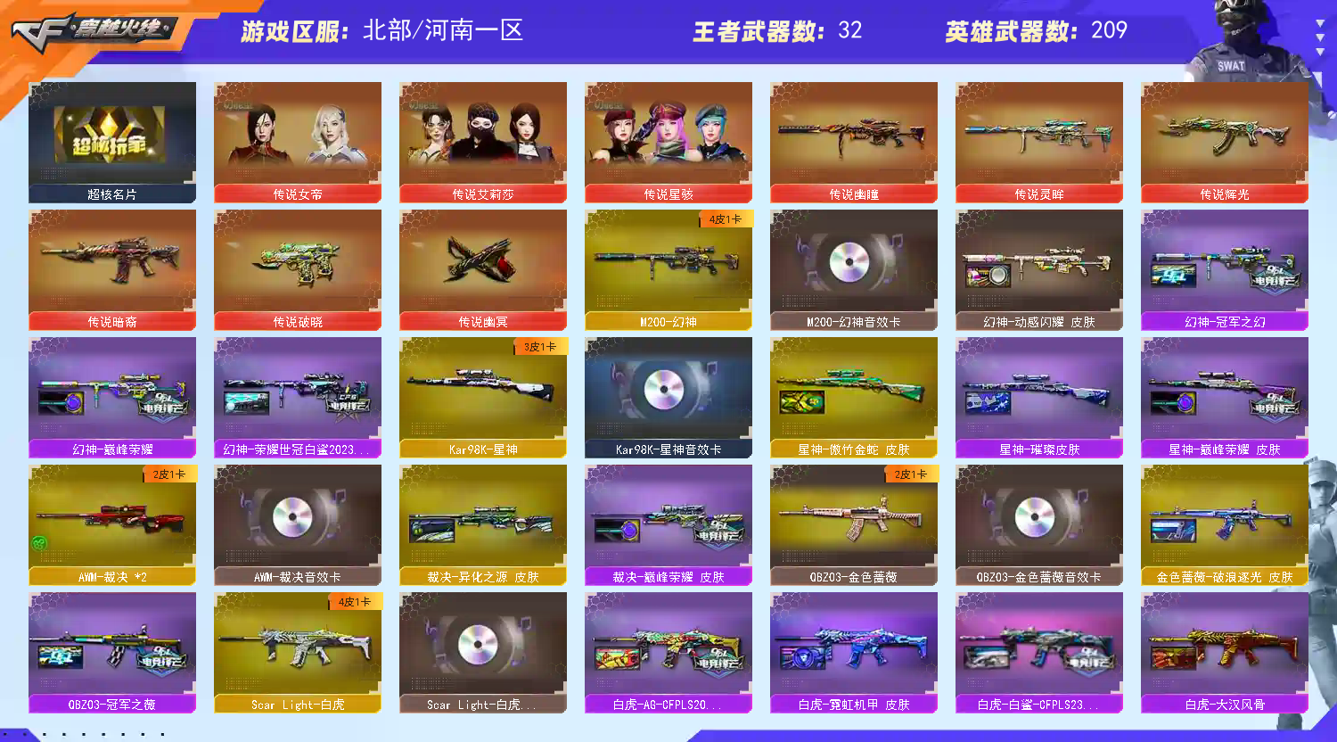 编号:HN648北部河南一区全能号✅四防传说女帝+6传说6烈蝴蝶5盘炼狱✅满配八面凌龙+幻神6件套+裁决5件套+带皮炽芒蝶刃✅雷暴夜魔套+星神5件套✅ 稀有武器:传说暗裔(序列号1541)、传说辉光、传说灵眸、传说幽瞳、传说破晓、传说幽冥、八面凌龙、M200幻神、98K星神、M200竞技荣光、G36C幻影、盘龙X5、炼狱X2、烈龙X6+斯泰尔蝴蝶X2、火麒麟X3、黑龙、雷神X2、黑骑士X3、无影、黑武士、天启、龙血、、HK417朱雀、Scar白虎、夜魔、幻灵、天罚、神工天巧、无影神兵利器、QBZ云龙、黑武士锦绣游龙、超星新热带奇洋、金色蔷薇古蛇密踪、M4A1玫瑰精灵、QBZ金色蔷薇、猎神、烈火、烈火动感闪耀、白虎电玩蓝兔、白虎之魄、毁灭、极光X3、裁决X2、暗月传说X4、雷霆、修罗X2、天神X2、COP雷霆、USP雷暴、破空枪刃夜魔、COP幻灵X2、柯尔特竞技荣光、USP神工天巧、天神动感闪耀、USP冥王、修罗古蛇密踪、柯尔特冠军之特X2、屠龙X2、擎麒麟刺、尼泊尔雷霆X2、斩神刀雷暴、麒麟刺堕天神、马来剑夜魔、幻灵之锋、擎天竞技荣光、炽芒蝶刃X2、唐刀神工天巧、屠龙动感闪耀、擎天云海游龙、云龙扇、龙啸热带奇洋、丛林匕首玄豹、 稀有角色:传说艾丽莎(四防副武器自动装弹/免疫队友炸弹伤害/减伤/减闪)、传说女帝(四防副武器自动装弹/免疫队友炸弹伤害/减伤/减闪)、四防电竞教官云悠悠、隼(四防佣兵觉醒/生存本能/生化觉醒/移动速度提升)、四防传说星骇、葵、四防晴雅、凌霄、鹰、影豹、炫、狐影、葵阿尔法武装、奇洋探员、乔伊教练、蛇隐宗、王者零、王者瞳闭月羞花、雪域霜狐、云海玲珑、暗夜审判 音效卡:M200幻神音效卡、八面凌龙音效卡、Scar白虎音效卡、星神音效卡、炼狱音效卡、龙啸热带奇洋音效卡、裁决音效卡、雷神音效卡、HK417朱雀电音效卡、黑骑士音效卡、QBZ金色蔷薇音效卡、火麒麟音效卡、毁灭音效卡、极光音效卡、屠龙动感闪耀音效卡、 稀有皮肤:八面凌龙不朽炫君皮肤/森林领主皮肤/星守炎龙皮肤/封心寒雪皮肤/辉耀王者皮肤、幻神荣耀世冠白鲨2023皮肤/巅峰荣耀皮肤/动感闪耀皮肤/冠军之幻皮肤、星神傲竹金蛇皮肤/璀璨皮肤/巅峰荣耀皮肤、QBZ金色蔷薇破浪逐光皮肤/冠军之薇皮肤、屠龙星耀皮肤/破浪逐光皮肤/星火燎原皮肤/荣耀之锋皮肤、幻影破浪逐光皮肤、烈火动感闪耀皮肤、裁决巅峰荣耀皮肤/异化之源皮肤、雷神赛博朋克皮肤/荣耀世冠AG皮肤/动感闪耀皮肤X2/耀金皮肤/杨戬皮肤/冠军之魄皮肤X2/宇航兔皮肤/CFPLS14冠军皮肤/星空皮肤/暗月皮肤/能量核心皮肤、白虎CFPLS23冠军皮肤/AGCFPLS20冠军皮肤/霓虹机甲皮肤/大汉风骨皮肤、炽芒蝶刃冠军炽芒皮肤/破浪逐光皮肤、火麒麟横秒之巅皮肤/巅峰荣耀皮肤/大唐荣光皮肤/心动糖果皮肤/平天大圣皮肤/冠军之心皮肤/盘古皮肤/AG战队皮肤/雷神皮肤/CFSTAR皮肤、黑骑士AGS4冠军典藏皮肤/冠军之势皮肤/耀金皮肤 王者武器:王者霜心、AK47雷暴王者、王者之影、王者芳薇、M4A1雷霆王者、王者青龙、王者之魄、王者之武、王者风神、王者凰鸣、王者之怒X2、COP雷霆王者、USP雷暴王者、雷霆王者之锋、王者冰锋、王者之锋、王者之击X2、炫金火麒麟、炫金武士、炫金骑士、炫金毁灭、炫金修罗 小人枪及特殊武器:M4A1再燃战线、M4A1赤狱骑士、HK417朱雀蛇隐宗、火麒麟绝迹、炼狱迷你小钢、王者COP精英刀锋、迷你宝贝、轻型军用手斧再燃战线、MK5炽火炎龙、毒蜂、异变清道夫、巴雷特零水下丽影、死亡之眼X2、黄金猫猫手套、苍雷、金刚伞、金刚伞电玩红兔、AWM灵狐15周年嘉年华、M37葵、Knife冠军之刃X2、 投掷武器及套装:雷霆套X6、雷暴套X4、堕天神套、夜魔套X7、电竞装甲套X2、幻灵套X4、竞技荣光套X2、神工天巧套X3、动感闪耀套、云海游龙套、云龙套、热带奇洋套、古蛇迷踪套。玄豹套、雷霆王者套、雷暴王者套、迷你生化手雷X6;USP-雷暴,USP-雷暴王者,传说幽冥,柯尔特-冠军之特,炽芒蝶刃,Knife-冠军之刃,传说星骇,