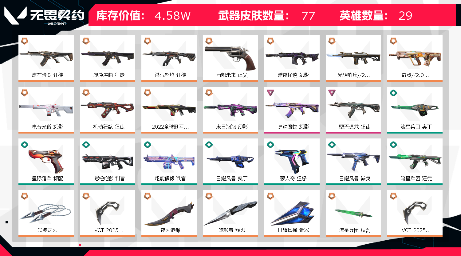 祝老板玩的愉快,喜欢可以收藏关注;黑波之刃,VCT 2025 爪刀,虚空遗器 狂徒,洪荒怒焰 狂徒,异鳞魔蛇 幻影,堕天遗武 狂徒,混沌序曲 狂徒,