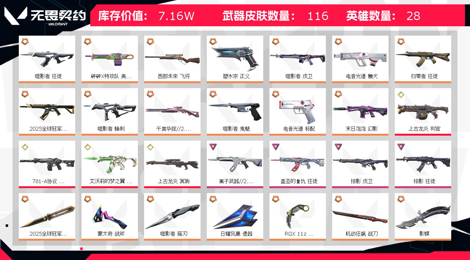 首页 > 租号大厅 > 无畏契约-wegame > wegame/wegame > 25冠军套、掠夺套、怜悯之刃、显卡爪刀、起源大狙、塑水宗正义、781m4等(价格公道请好好对待账号)