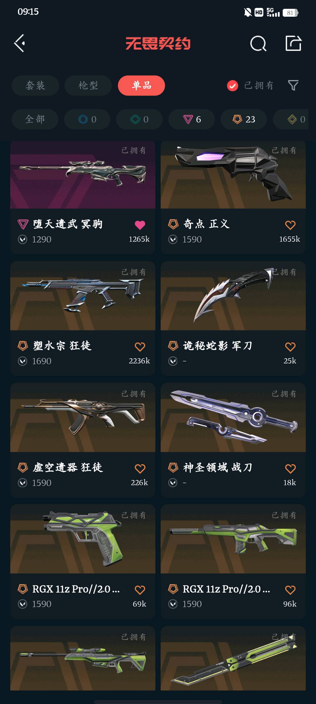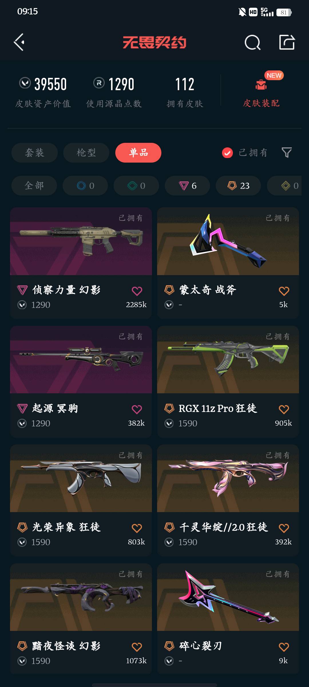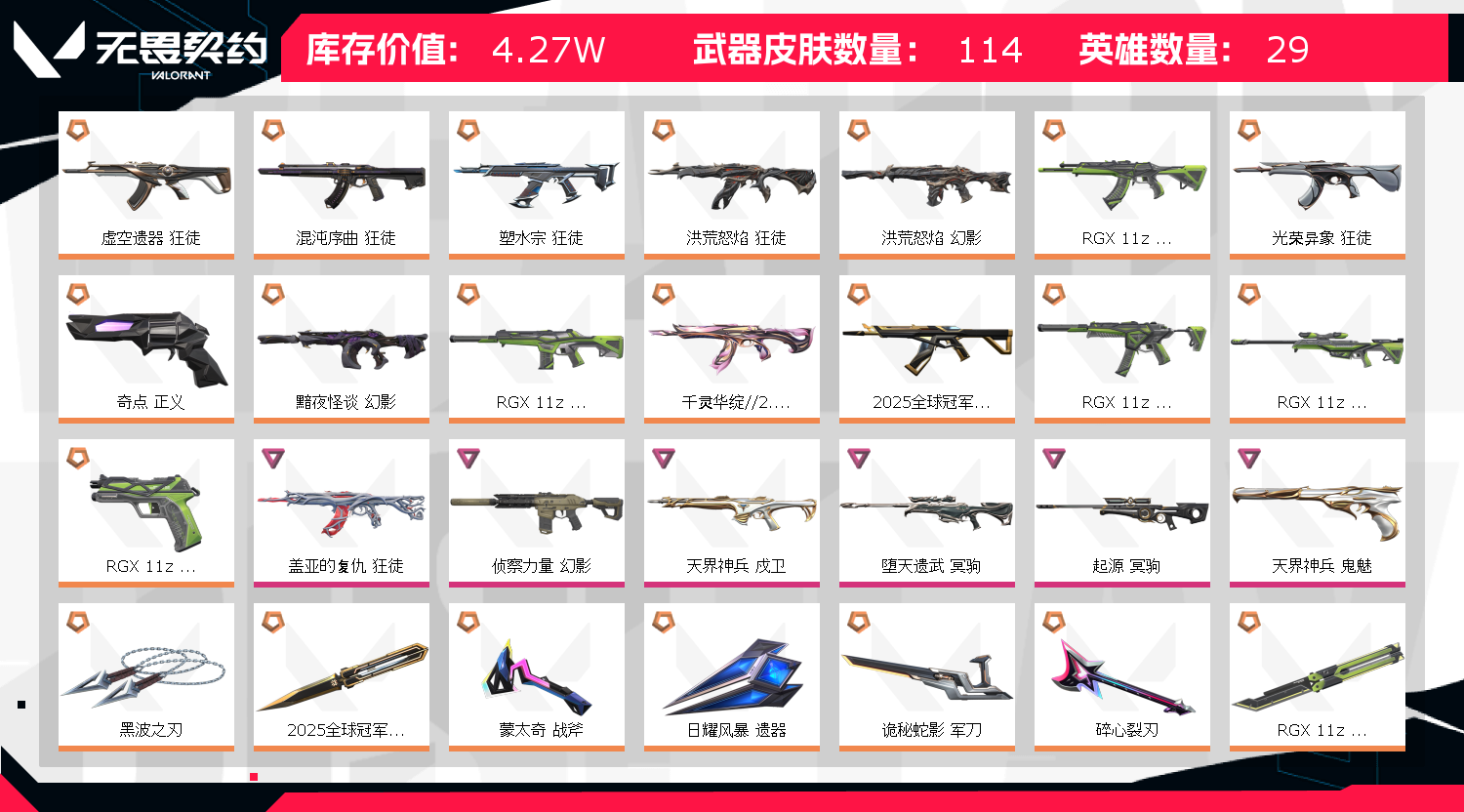 全英雄 武器皮肤数量114 禁止挂机开挂辱骂等行为 不得使用账号内道具 不得发送政治敏感话题 不得使用账号打广告等行为;黑波之刃,盖亚的复仇 狂徒,虚空遗器 狂徒,洪荒怒焰 狂徒,侦察力量 幻影,洪荒怒焰 幻影,RGX 11z Pro 狂徒,
