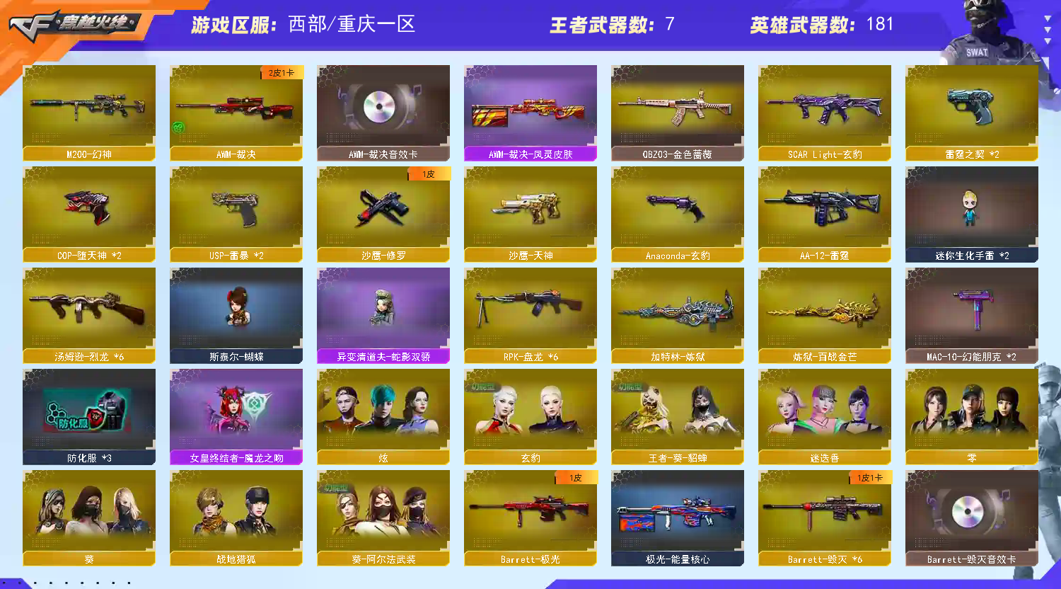 【亮点解析 裁决三件套】【m200幻神+usp雷暴】【6盘龙 炼狱 6烈龙 异变清道夫-蛇影双骄 斯太尔蝴蝶 】【白虎电玩】【qbz金色蔷薇】【火麒麟+卡】【黑龙】【雷神+卡+荣耀之魄】【黑骑士+卡】【毁灭+卡+cfs2018】【极光】【裁决 +裁决音效卡+凤灵】【堕天神套装/雷暴套装/玄豹套装】【武器:雷霆 雷暴 堕天神 玄豹 王者之翼 王者之武 王者之魄 】【10手枪:修罗 天神 雷霆*2 雷暴*2 堕天神*2 玄豹】【15刀具:屠龙*2 龙啸 擎天 麒麟刺 尼泊尔雷霆 斩神刀雷暴 堕天神*3 王者之锋 玄豹】【18雷套:雷霆雷*7 雷暴雷*5 堕天神*6】【小人枪:火麒麟灵狐 】【音效卡:黑骑士音效卡 裁决音效卡 毁灭音效卡 火麒麟音效卡 雷神音效卡 】【四防角色:王者葵貂蝉 】【10w点券】;USP-雷暴,RPK-盘龙,QBZ03-金色蔷薇,M200-幻神,