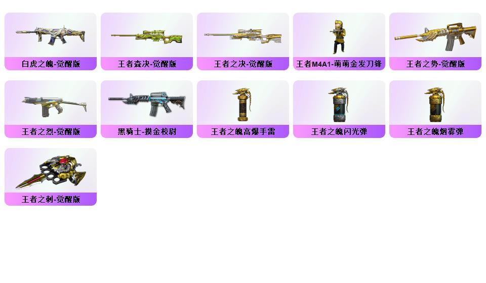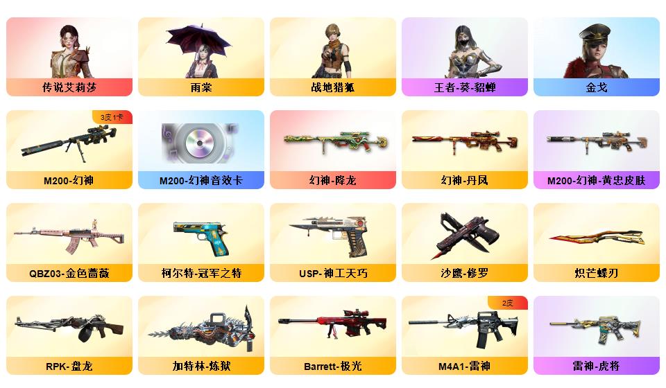 传说艾莉莎/传说辉光/传说圣灵//M200-幻神/幻神-黄忠/幻神-丹凤/幻神-降龙/幻神音效卡/白虎之魄/炽芒蝶刃/USP-嘉年华柯基/Knife-冠军之刃/