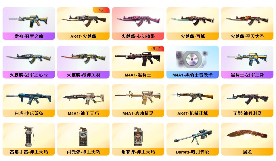 传说艾莉莎/传说辉光/传说圣灵//M200-幻神/幻神-黄忠/幻神-丹凤/幻神-降龙/幻神音效卡/白虎之魄/炽芒蝶刃/USP-嘉年华柯基/Knife-冠军之刃/柯尔特-冠军之特/USP神功天巧