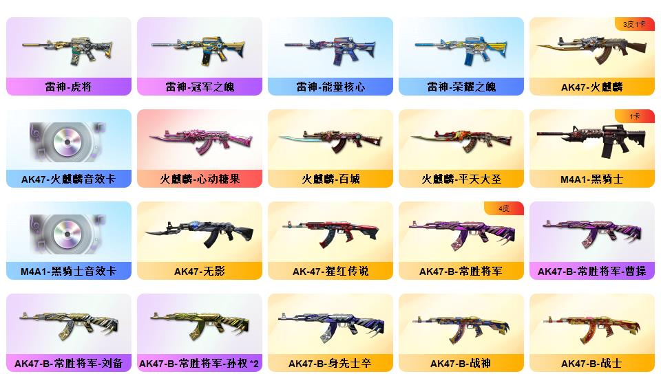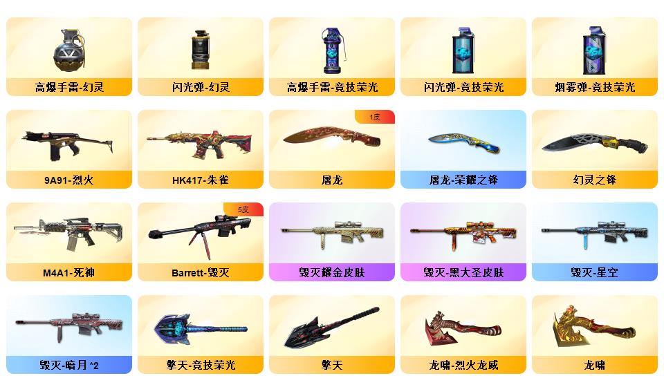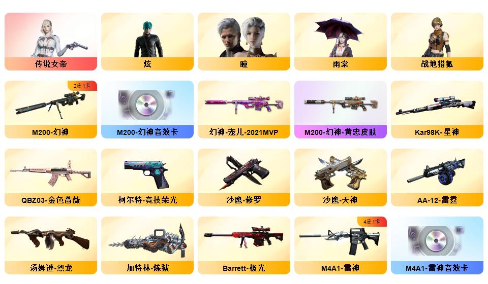 传说女帝/传说圣灵/M200-幻神/幻神-宠儿/幻神-黄忠/幻神音效卡/Kar98K-星神/雷神+冠军+荣耀+音效卡/竞技荣光柯尔特/cop雷霆王者/金色蔷薇