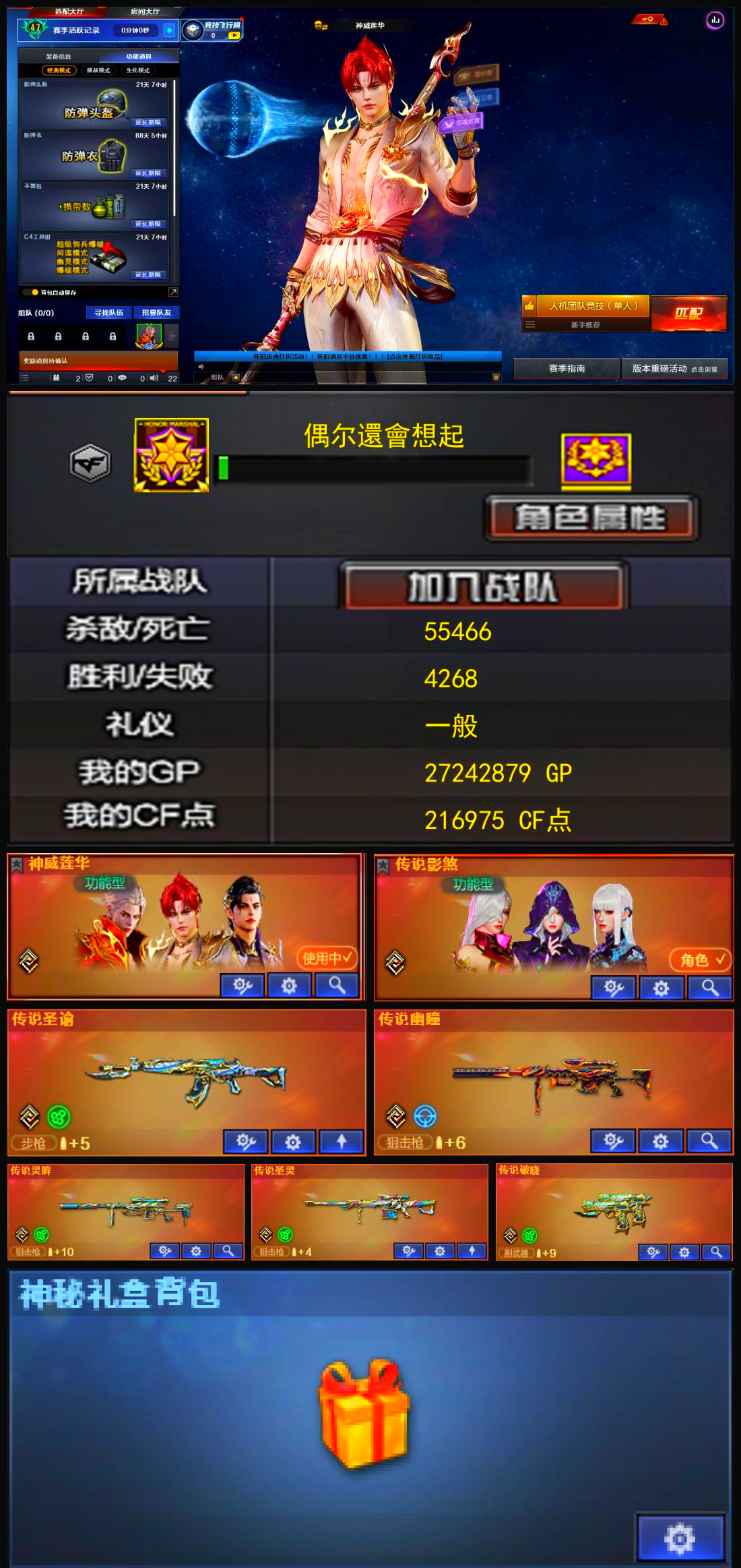 氪金天花板♥双全神威影煞幽瞳灵眸金色礼盒♥幻神4皮♥6把蝴蝶刀泡泡象炼狱金色狮子双蝴蝶生化天花板