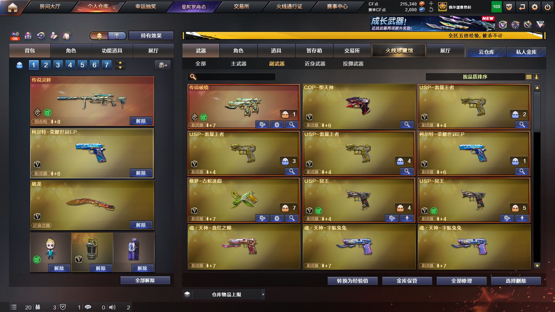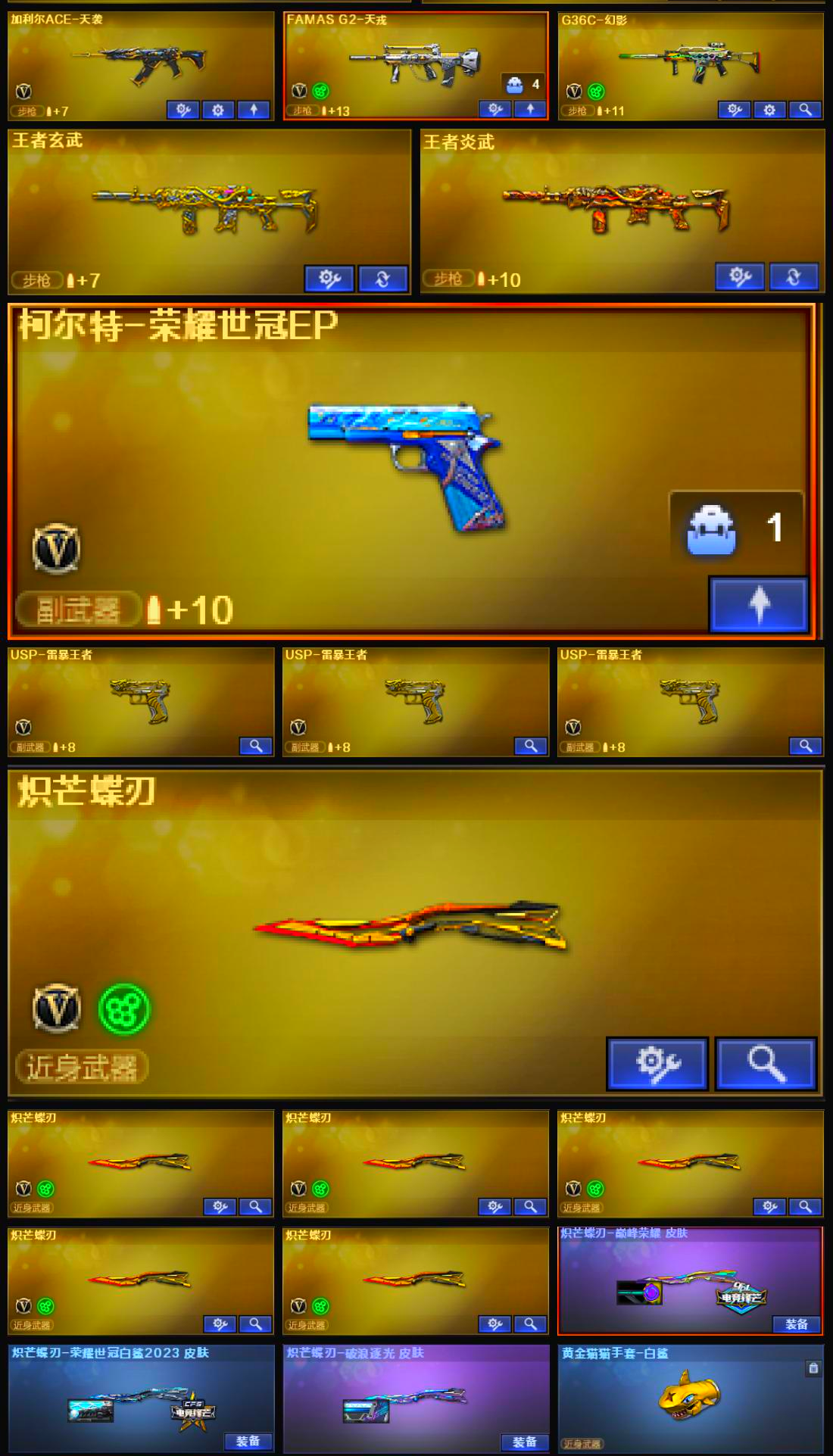 氪金天花板♥双全号神威影煞幽瞳灵眸金色礼盒♥幻神4皮(周瑜、ag24、ep)♥6把蝴蝶刀泡泡象炼狱金色狮子隼蝴蝶生化天花板7副手;USP-雷暴王者,炽芒蝶刃,传说影煞,隼,王者沙漠玫瑰,RPK-盘龙,传说幽瞳,