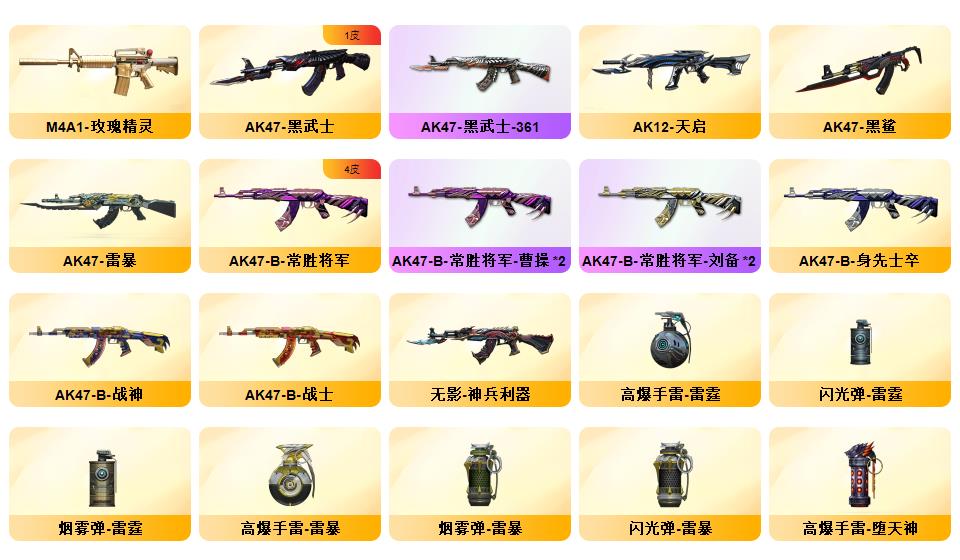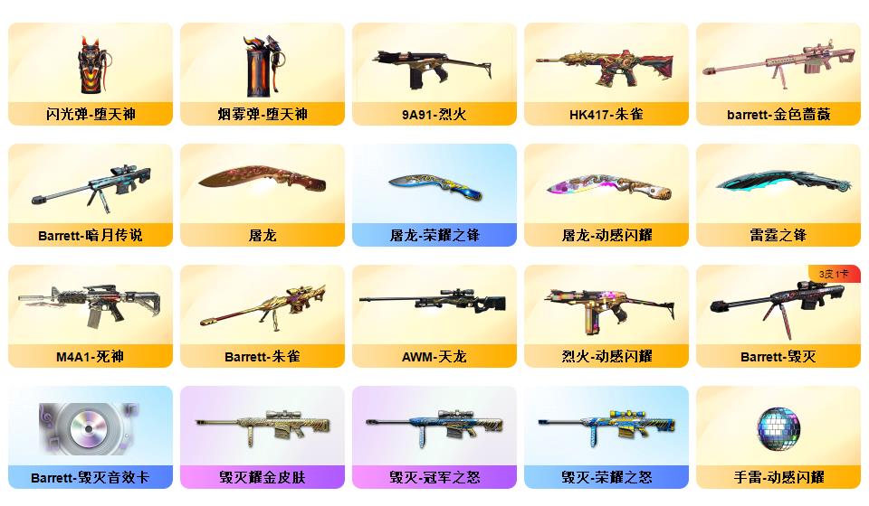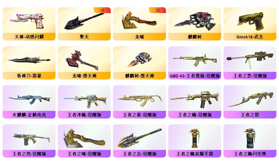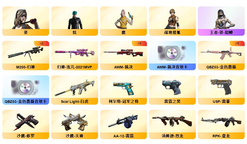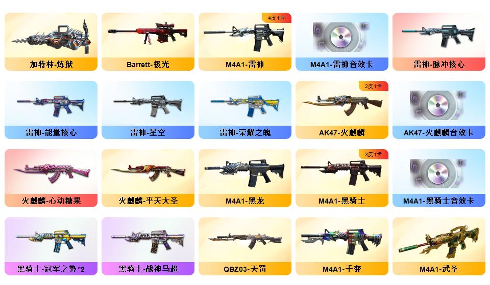 幻神宠儿/冠军之特/2usp雷暴/6列/4盘/COP雷霆/白虎/QBZ天罚/毁灭冠军之怒/黑骑士冠军之势/修罗冠军之魂/毁灭荣耀之怒/毁灭耀金/天龙CFSTAR/雷神荣耀之魄/雷神能量核心/雷暴套装/AWM-裁决音效卡/M4A1-黑骑士音效卡/QBZ03-金色蔷薇音效卡/火麒麟音效卡/毁灭音效卡/雷神音效卡