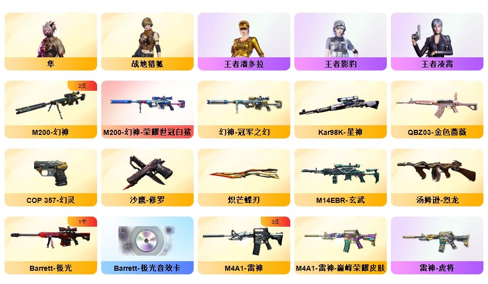 传说灵眸/M200-幻神/幻神世冠白鲨/幻神冠军之幻/Kar98K-星神/王者白虎/玄武/qbz/6烈龙+蝴蝶/炽芒蝶刃/王者芳薇/冠军之刃*2