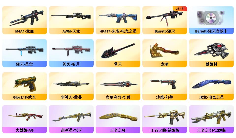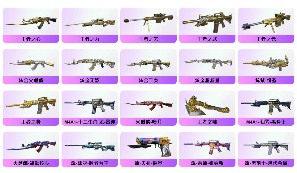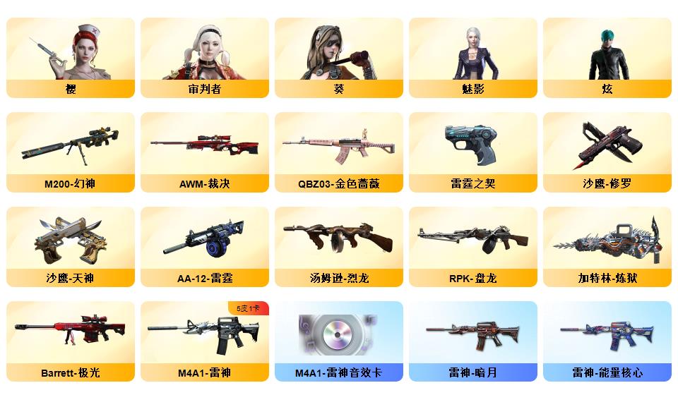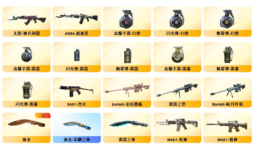幻神+毁灭(音效卡)+火麒麟(AG战队+音效卡)+雷神(荣耀之魄+音效卡)+QBZ-03-金色蔷薇+沙鹰-修罗*8+沙鹰-幻兽*1+COP-雷霆*1+幻兽手雷1套+8套手雷+7盘龙+3炼狱+8烈龙+斯泰尔-蝴蝶+死亡之眼