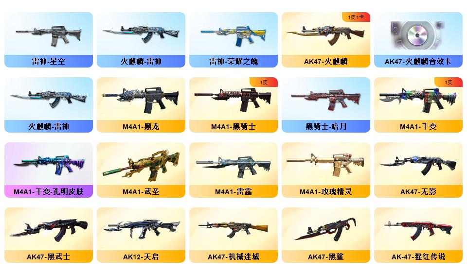 幻神+毁灭(音效卡)+火麒麟(AG战队+音效卡)+雷神(荣耀之魄+音效卡)+QBZ-03-金色蔷薇+沙鹰-修罗*8+沙鹰-幻兽*1+COP-雷霆*1+幻兽手雷1