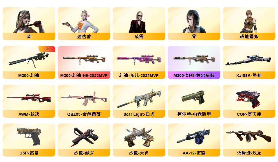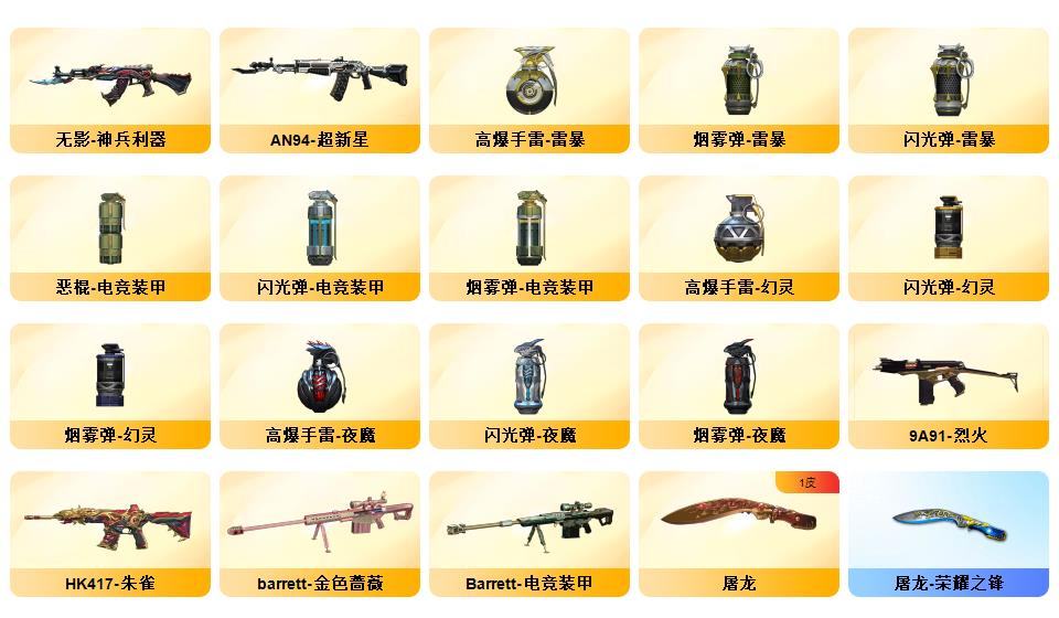 传说暗裔/M200-幻神/幻神N9/幻神宠儿/幻神黄忠王者幻神/98K-星神/白虎/qbz/6烈龙+蝴蝶/7炼狱/雷暴*2/电竞装甲套装/夜魔套装/雷暴套装/极