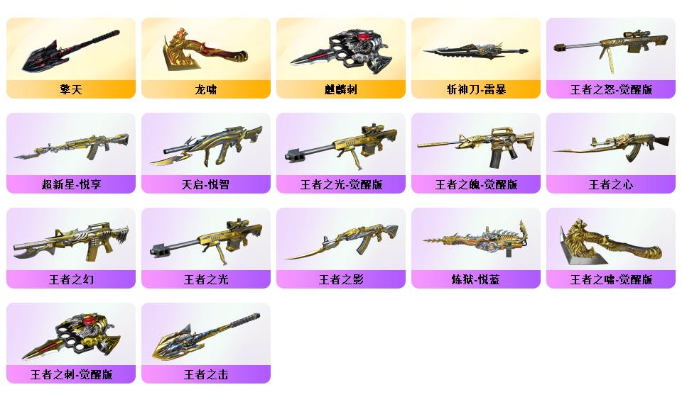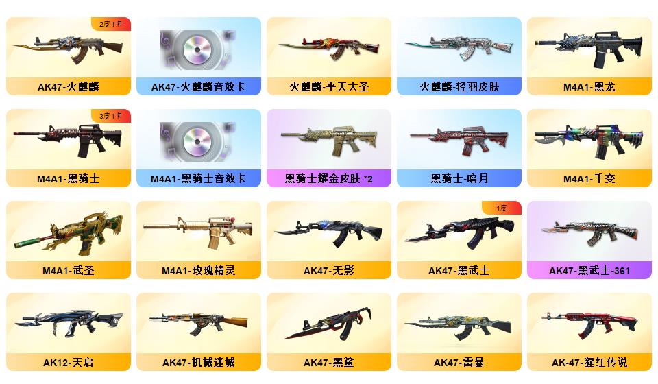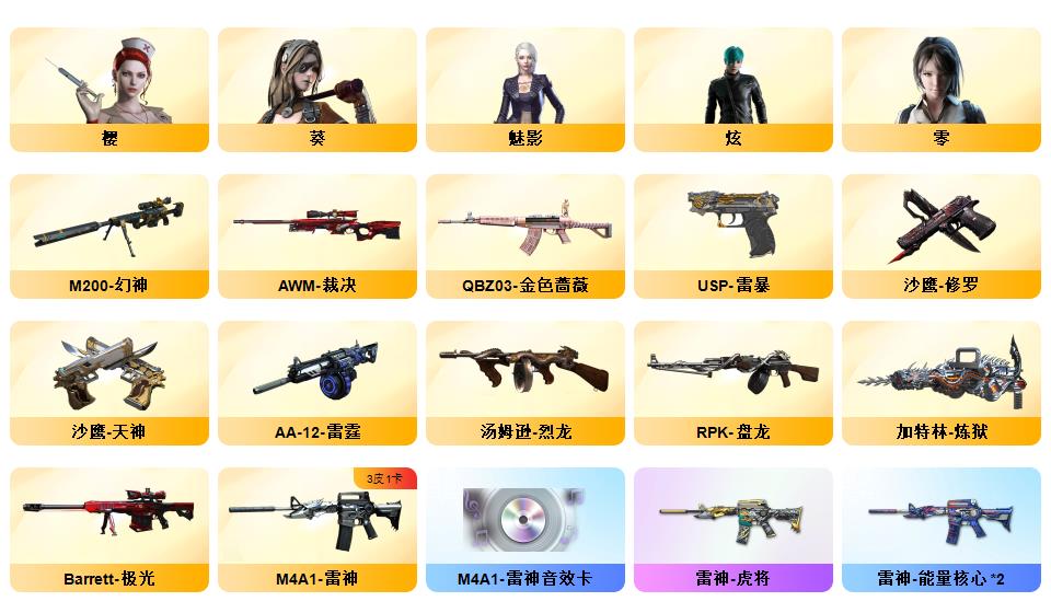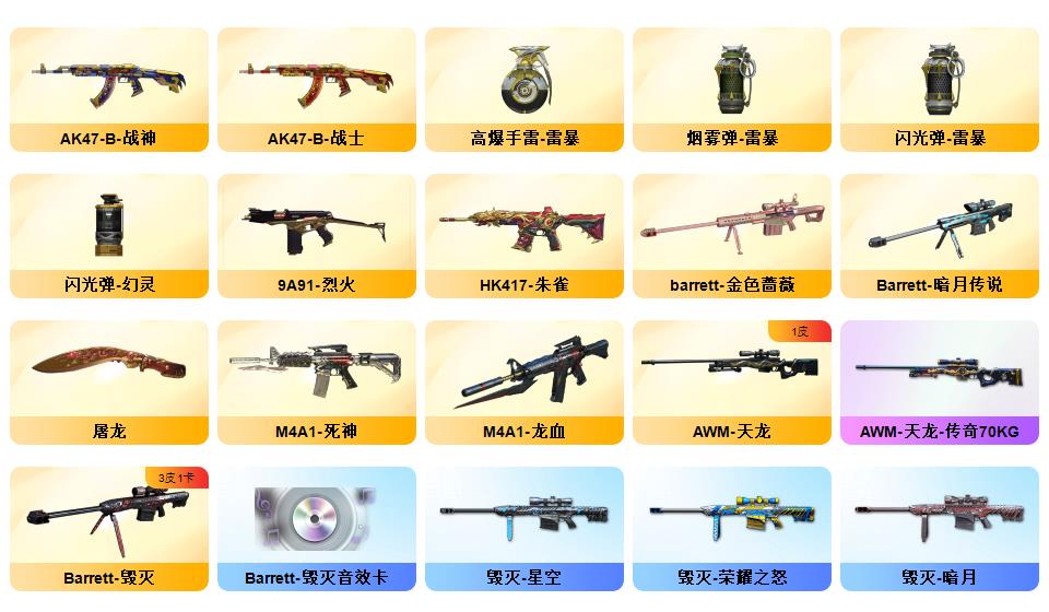 幻神+毁灭(荣耀之怒+音效卡)+火麒麟(AG战队+音效卡)+雷神(虎将+音效卡)+朱雀+QBZ+沙鹰-修罗*3+沙鹰-天神*5+USP雷爆*1+手雷套*5+4盘龙+1炼狱+7烈龙+斯泰尔-蝴蝶+死亡之眼