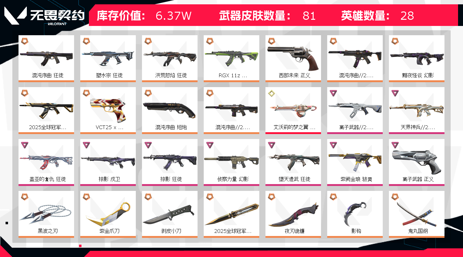 首页 > 租号大厅 > 无畏契约-wegame > wegame/wegame > 6.3万库存🔥25冠军🏆剥皮小刀+黑波+影钩🔥混沌+塑水+显卡+流脓狂徒