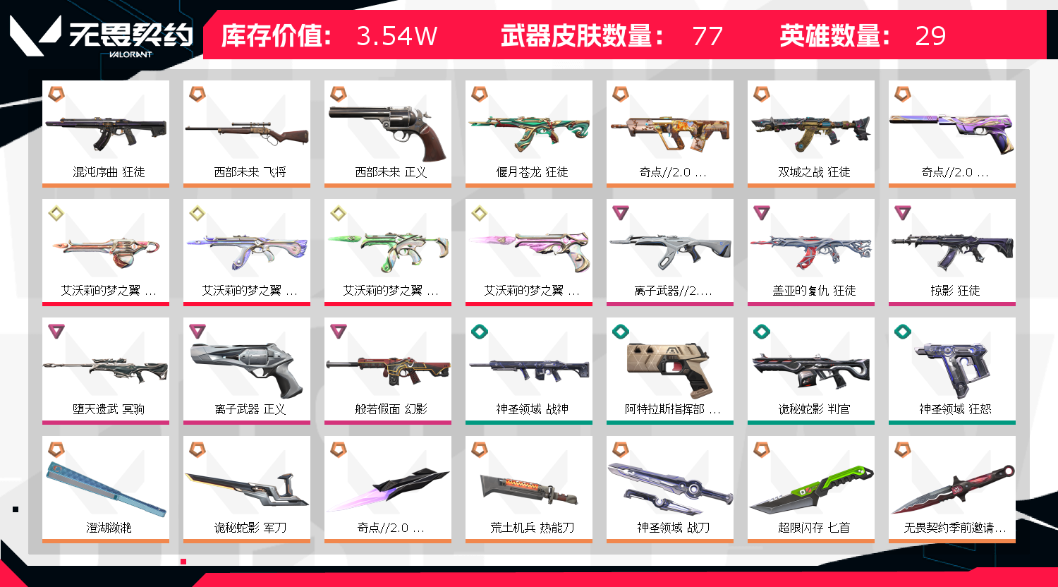 请文明上网 英雄28 武器皮肤数量77,艾沃莉的梦之翼差仙女棒全套,8把卓越及以上品质狂徒,堕天遗武冥驹,西部未来正义,西部未来飞将,离子武器正义,掠影狂徒;艾沃莉的梦之翼 奥丁,盖亚的复仇 狂徒,掠影 狂徒,混沌序曲 狂徒,离子武器//2.0 狂徒,堕天遗武 冥驹,西部未来 飞将,