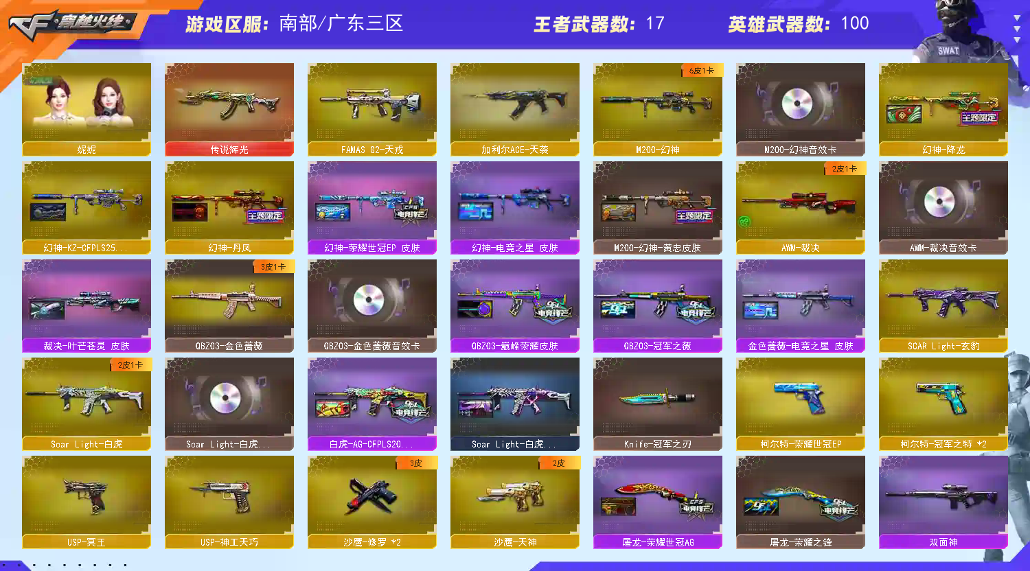 禁止一切外挂;柯尔特-冠军之特,Knife-冠军之刃,妮妮,QBZ03-金色蔷薇,M200-幻神,Scar Light-白虎,加利尔ACE-天袭,