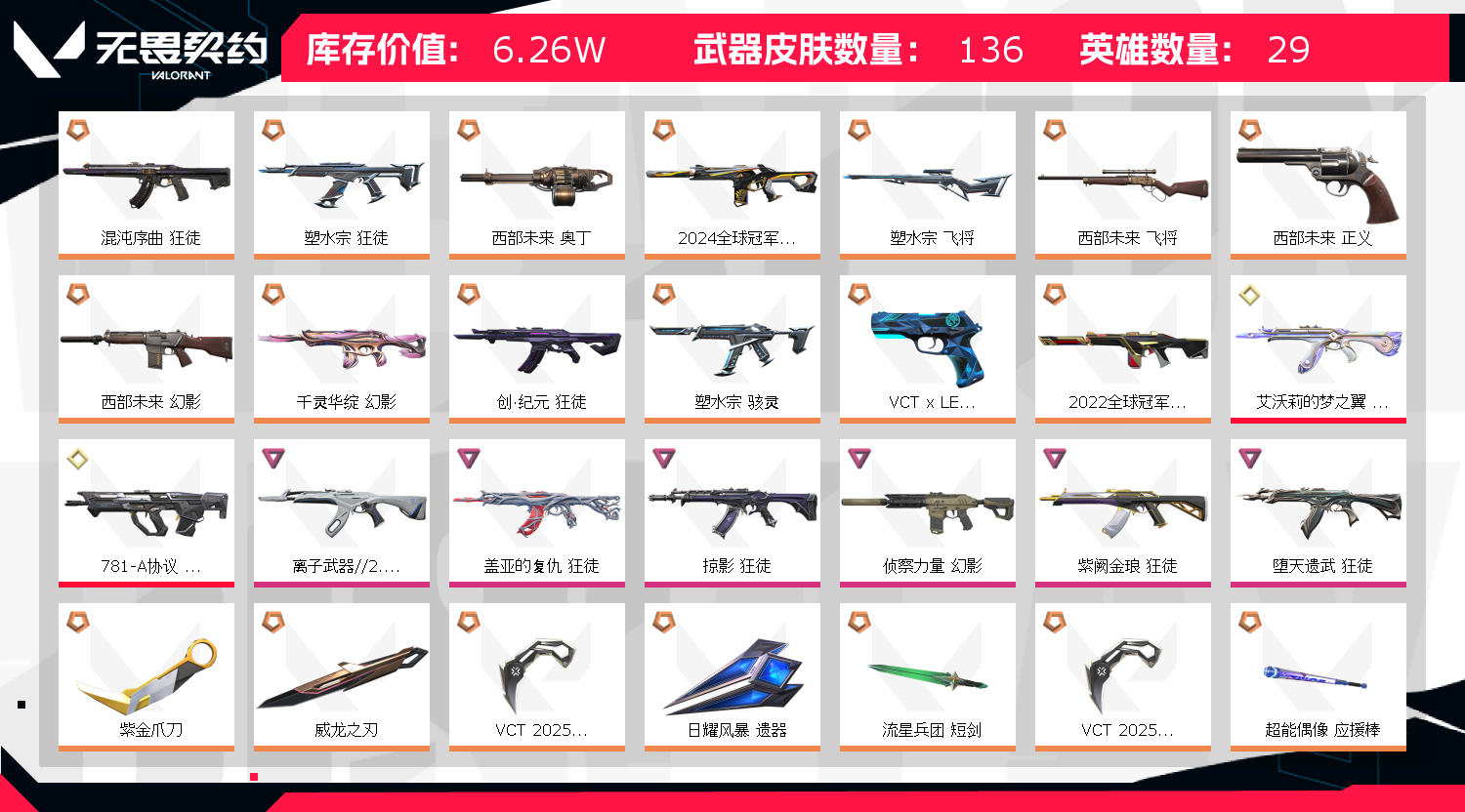 禁止炸鱼62600库存135皮;西部未来 奥丁,紫金爪刀,威龙之刃,VCT 2025 爪刀,盖亚的复仇 狂徒,掠影 狂徒,侦察力量 幻影,
