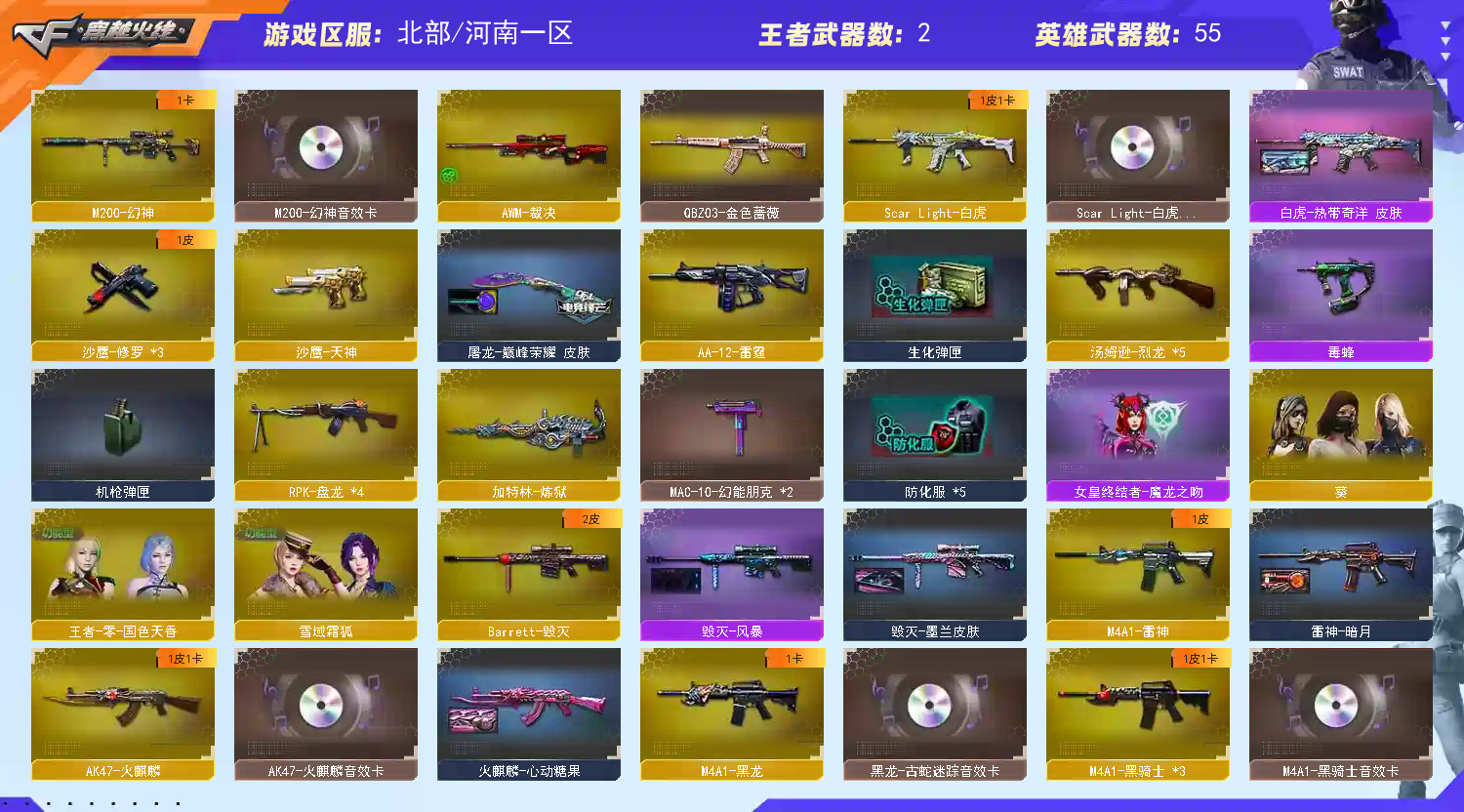 首页 > 租号大厅 > 穿越火线 > 北部/河南一区 > 幻神➕音卡白虎三件套火麒麟三件套4盘6烈炼狱毒蜂