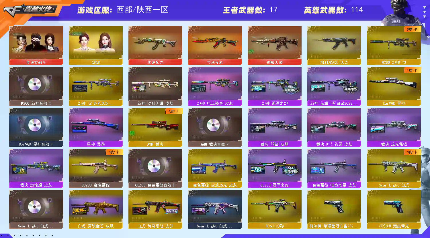 【商品标题】:西部陕西一区-122V-可二次实名-【Lv.100.2-高阶大元帅】-【段位:荣耀枪王】 【稀有武器】:传说辉光/传说夜影/M200-幻神(3)/Kar98K-星神/G36C-幻影/ScarLight-白虎/M14EBR-玄武/COP-堕天神/柯尔特-竞技荣光/柯尔特-荣耀世冠白鲨2023/修罗-古蛇迷踪/柯尔特-冠军之特(2)/金色蔷薇-古蛇迷踪/QBZ03-金色蔷薇/AK47-火麒麟/M4A1-雷神(2)/M4A1-黑骑士/白虎-电玩蓝兔/Barrett-毁灭(2)/Barrett-极光/AWM-裁决/M200-竞技荣光/加特林-炼狱/汤姆逊-烈龙(5)/AA-12-雷霆/炽芒蝶刃(6)/擎天-竞技荣光 【王者武器】:王者之怒-觉醒版 【热门角色】:传说艾莉莎/关小雨/鹰/影豹/奇洋探员/乔伊教练/蛇隐宗/王者-魅影/炽天使/空/灵狐者-职业经理/潘多拉-X/兔囡囡/幽/潘多拉 【热门音效卡】:M200-幻神音效卡/Kar98K-星神音效卡/AWM-裁决音效卡/Scar Light-白虎音效卡/QBZ03-金色蔷薇音效卡/M4A1-黑骑士音效卡 【热门皮肤】:幻神-荣耀世冠白鲨2023皮肤/幻神-冠军之幻/幻神-电流骇客皮肤/幻神-动感闪耀皮肤/雷神-HeartShot皮肤/金色蔷薇-破浪逐光皮肤/屠龙-星耀皮肤/星神-漫游/裁决-羽掣皮肤/QBZ03-冠军之薇/裁决-流光秘银/ScarLight-白虎-暗星/火麒麟-冠军之心/毁灭-冠军之怒/屠龙-荣耀之锋(2)/屠龙-春桃皮肤(2)/龙啸-冠军之啸/雷神-荣耀之魄 【其他亮点】:贝雷塔687-射手座/茸茸小松狮/烟雾弹-荣耀世冠白鲨2023 (截图展示段位不代表实际段位,如赛季更新等不可抗拒因素发生变化,其余道具看截图或咨询客服);