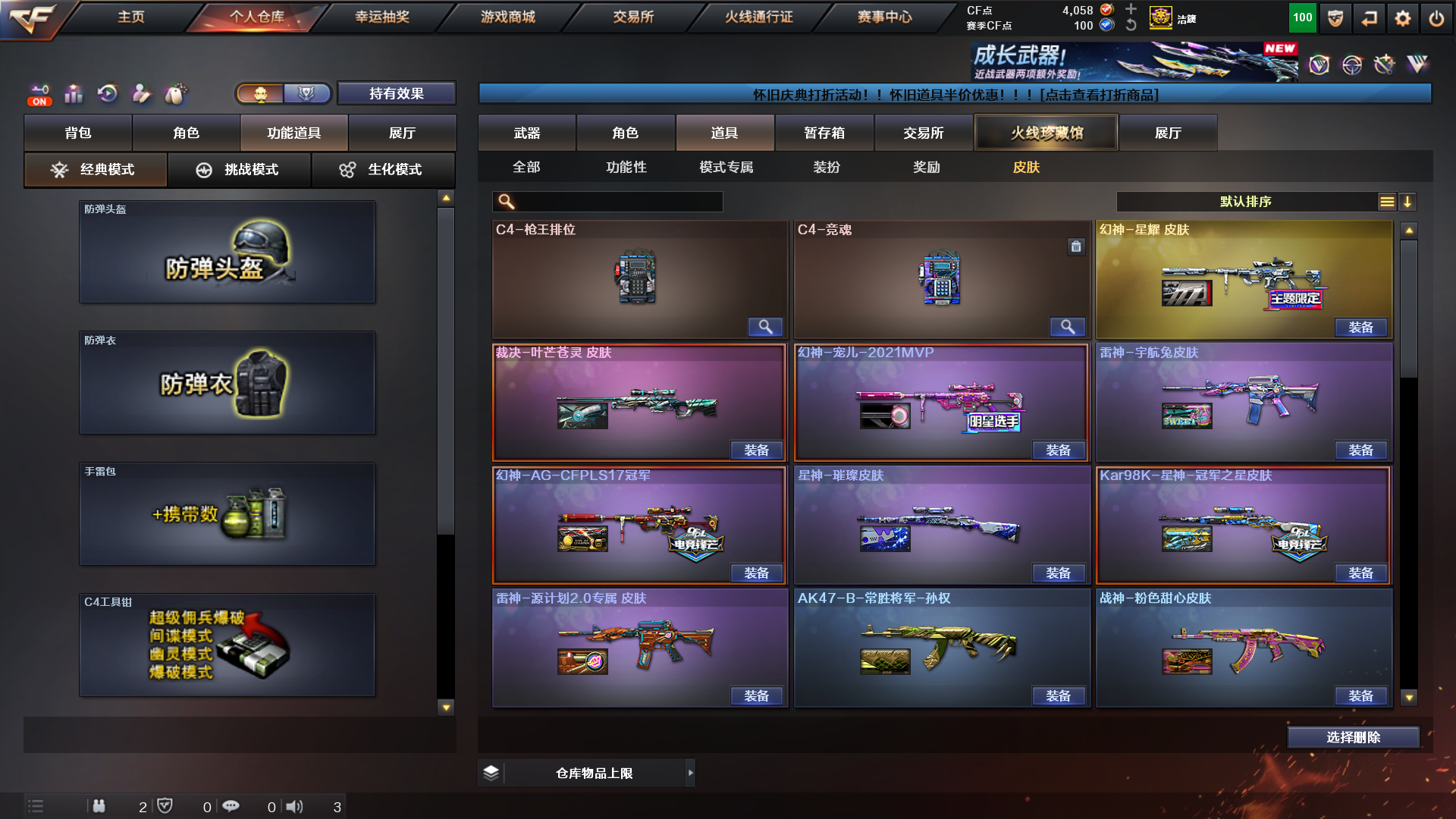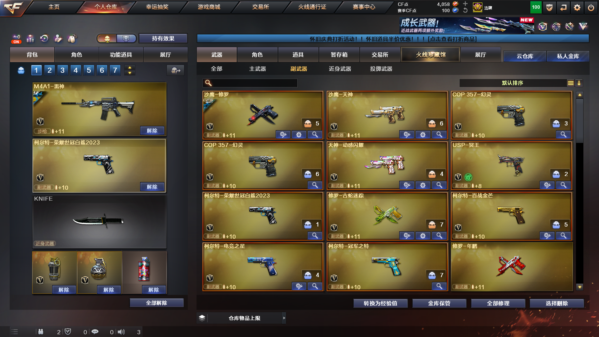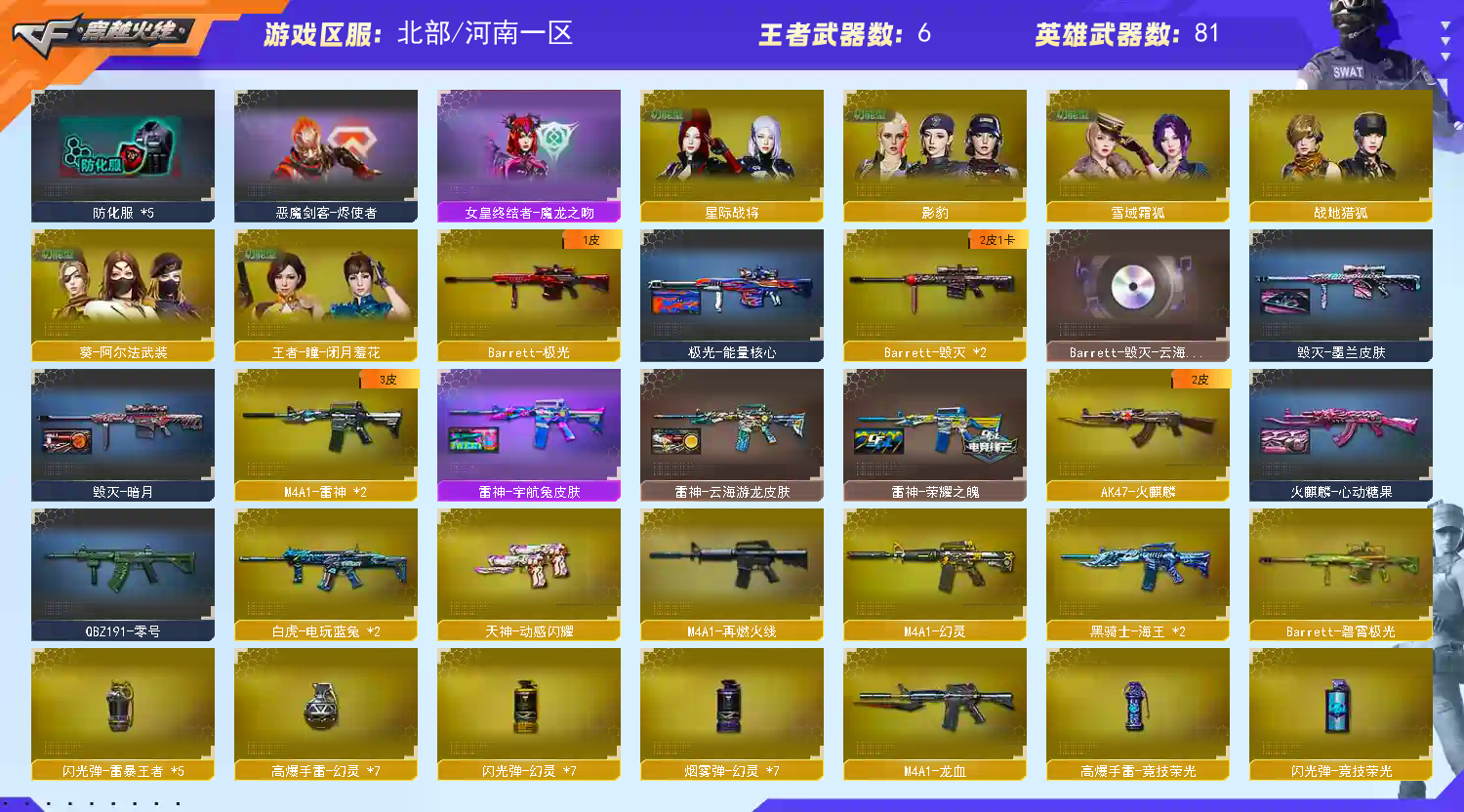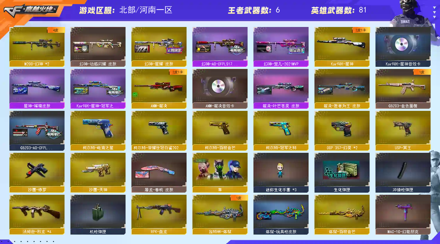 热门主武:2把M200-幻神 Kar98K-星神 AWM-裁决 QBZ03-金色蔷薇 4把汤姆逊-烈龙 RPK-盘龙 加特林-炼狱 炼狱-百战金芒 Barrett-极光 2把Barrett-毁灭 2把M4A1-雷神 AK47-火麒麟 QBZ191-零号 2把白虎-电玩蓝兔 Barrett-碧霄极光 M4A1-龙血 死亡之眼 烈龙-云海游龙 烈火-动感闪耀 天罚-斗烈龙驹 HK417-朱雀-电竞之星 极品副武器:柯尔特-电竞之星 柯尔特-荣耀世冠白鲨2023 柯尔特-百战金芒 柯尔特-冠军之特 x2COP 357-幻灵 USP-冥王 x2柯尔特-萌杀 天神-动感闪耀 凤凰之火 极品近战:迷你牛牛 猫猫手套 屠龙-斗烈龙驹 麒麟刺-百战金芒 屠龙-电竞之星 极品投掷:竞技荣光套装 极品音效卡:Kar98K-星神音效卡 AWM-裁决音效卡 极品皮肤:幻神:幻神-动感闪耀 幻神-星耀 幻神-AG-CFPLS17冠军 幻神-宠儿-2021MVP 星神:璀璨 冠军之星 裁决:叶芒苍灵 qbz金色蔷薇:AG-CFPLS19冠军 雷神:荣耀之魄 热门角色:隼 星际战将 影豹 雪域霜狐 战地猎狐 葵-阿尔法武装 王者-瞳-闭月羞花 幻面灵狐;柯尔特-荣耀世冠白鲨2023,柯尔特-冠军之特,隼,RPK-盘龙,QBZ03-金色蔷薇,M200-幻神,Kar98K-星神,
