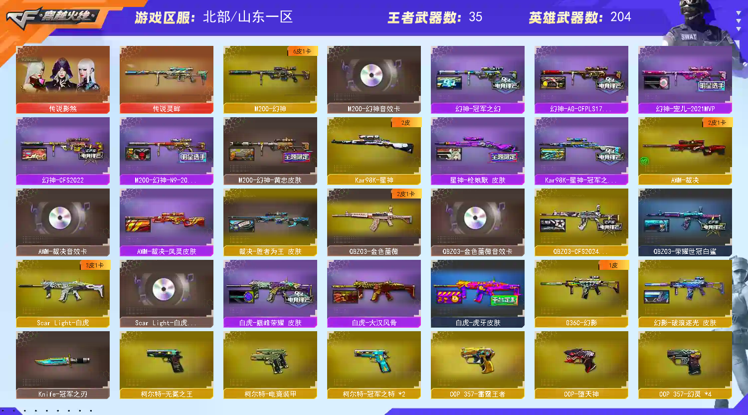 【商品标题】:北部山东一区-215V-可二次实名-【Lv.100.1-大元帅】-【段位:传奇2】 【稀有武器】:传说灵眸/M200-幻神/Kar98K-星神/G36C-幻影/ScarLight-白虎/HK417-朱雀/M4A1-夜魔/M4A1-幻灵/M4A1-神工天巧/AK47-雷暴/M4A1-堕天神/USP-雷暴/COP-堕天神/破空枪刃-夜魔/柯尔特-电竞装甲/COP357-幻灵(4)/USP-神工天巧/COP357-云龙/柯尔特-无冕之王/柯尔特-冠军之特(2)/QBZ03-云龙/QBZ03-金色蔷薇/AK47-火麒麟(3)/M4A1-黑龙/M4A1-雷神(4)/M4A1-黑骑士(2)/AK47-无影/AK47-黑武士/Barrett-毁灭(4)/Barrett-极光/AWM-裁决/Barrett-电竞装甲/RPK-盘龙/加特林-炼狱(2)/汤姆逊-烈龙(3)/AA-12-雷霆/炽芒蝶刃/斩神刀-雷暴/麒麟刺-堕天神(3)/龙啸-堕天神/尼泊尔-电竞装甲/幻灵之锋/唐刀-神工天巧/云龙扇(2) 【王者武器】:王者之心-觉醒版/王者之魄-觉醒版/QBZ-03-王者蔷薇-觉醒版/王者芳薇-觉醒版/王者之怒-觉醒版/王者之光-觉醒版/王者之决-觉醒版/王者幻神-觉醒版/王者风神-觉醒版/M4A1-雷霆王者/王者星霆 【热门角色】:传说影煞/春/电竞教官-云悠悠/兰-巾帼英雄/晴雅/沙漠玫瑰/鹰/影豹/隼/魅影/奇洋探员/王者春/王者-魅影/王者潘多拉/王者影豹/新海豹突击队/灵狐者-职业经理/女主播/潘多拉-X/职业选手/潘多拉 【热门音效卡】:M200-幻神音效卡/AWM-裁决音效卡/Scar Light-白虎音效卡/QBZ03-金色蔷薇音效卡/M4A1-雷神音效卡(2)/Barrett-毁灭音效卡/M4A1-黑骑士音效卡(2)/AK47-火麒麟音效卡/M4A1-黑龙音效卡/Barrett-极光音效卡(2) 【热门皮肤】:M200-幻神-N9-2022MVP/幻神-宠儿-2021MVP/幻神-AG-CFPLS17冠军/幻神-冠军之幻/幻神-CFS2022/幻影-破浪逐光皮肤/QBZ03-CFS2024皮肤/火麒麟-白虎/雷神-高能霹雳 皮肤/屠龙-星火燎原/M4A1-雷神-巅峰荣耀皮肤/Kar98K-星神-冠军之星皮肤/屠龙-荣耀世冠AG/擎天-冠军之击(2)/星神-枪娘默 皮肤/白虎-巅峰荣耀 皮肤/屠龙-破浪逐光皮肤/黑龙-冠军之武/火麒麟-大唐荣光/白虎-大汉风骨/炽芒蝶刃-破浪逐光皮肤/毁灭-直播专属/白虎-虎牙皮肤/传奇石头-横秒之巅/QBZ03-荣耀世冠白鲨/炼狱-虎牙皮肤/毁灭-战神张飞/黑骑士-战神马超/雷神-宠儿-2019MVP/雷神-传奇N9/极光-高能霹雳皮肤/黑骑士-AG-S4冠军典藏/屠龙-荣耀之锋(2)/毁灭-荣耀之怒/屠龙-春桃皮肤/龙啸-冠军之啸/毁灭-CFS2020/雷神-荣耀之魄 【其他亮点】:斯泰尔-蝴蝶/炼狱-迷你小钢(2)/Knife-冠军之刃/柯尔特-赛博朋克/MK5-炽火炎龙/Scar Light-马枪 (截图展示段位不代表实际段位,如赛季更新等不可抗拒因素发生变化,其余道具看截图或咨询客服);